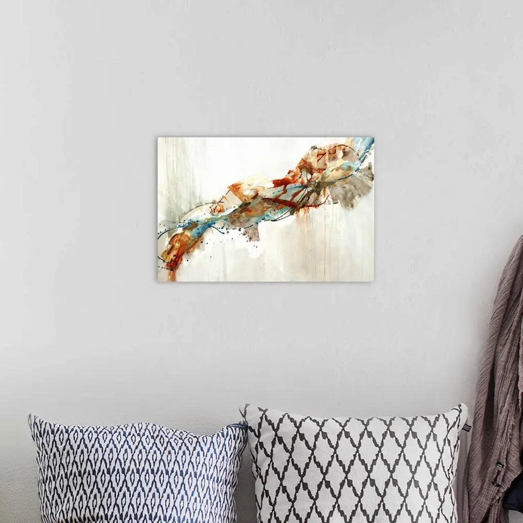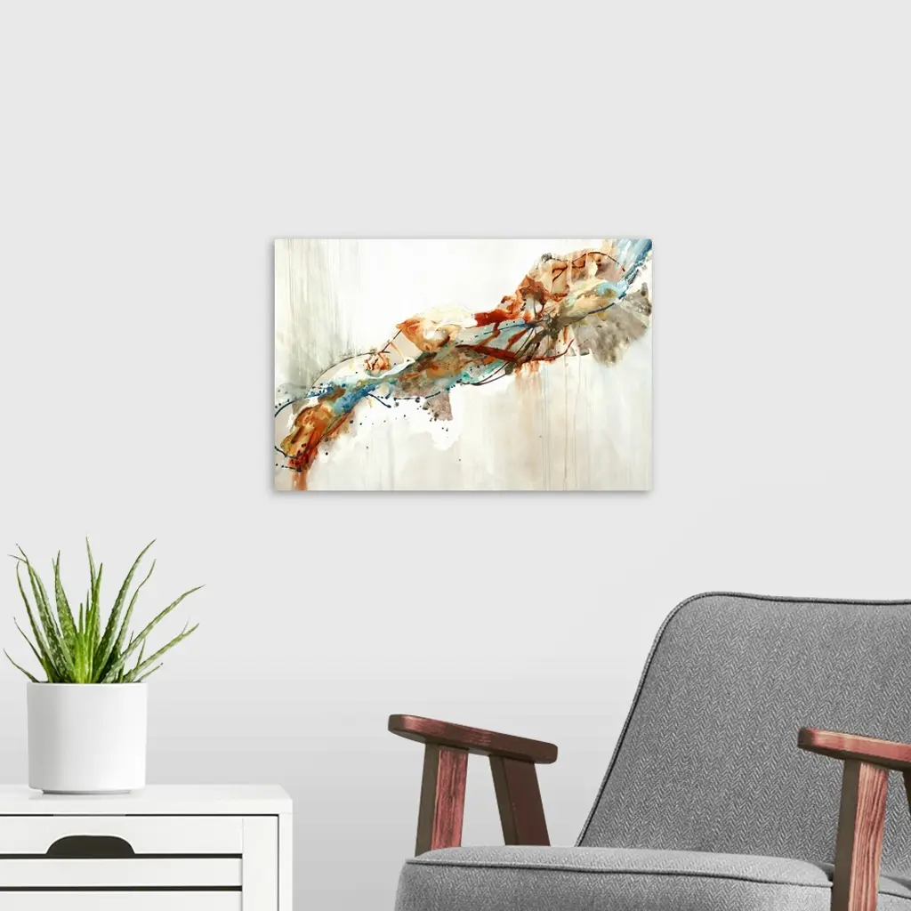 Abstract painting with a diagonal line of colors coming together on a neutral toned background.