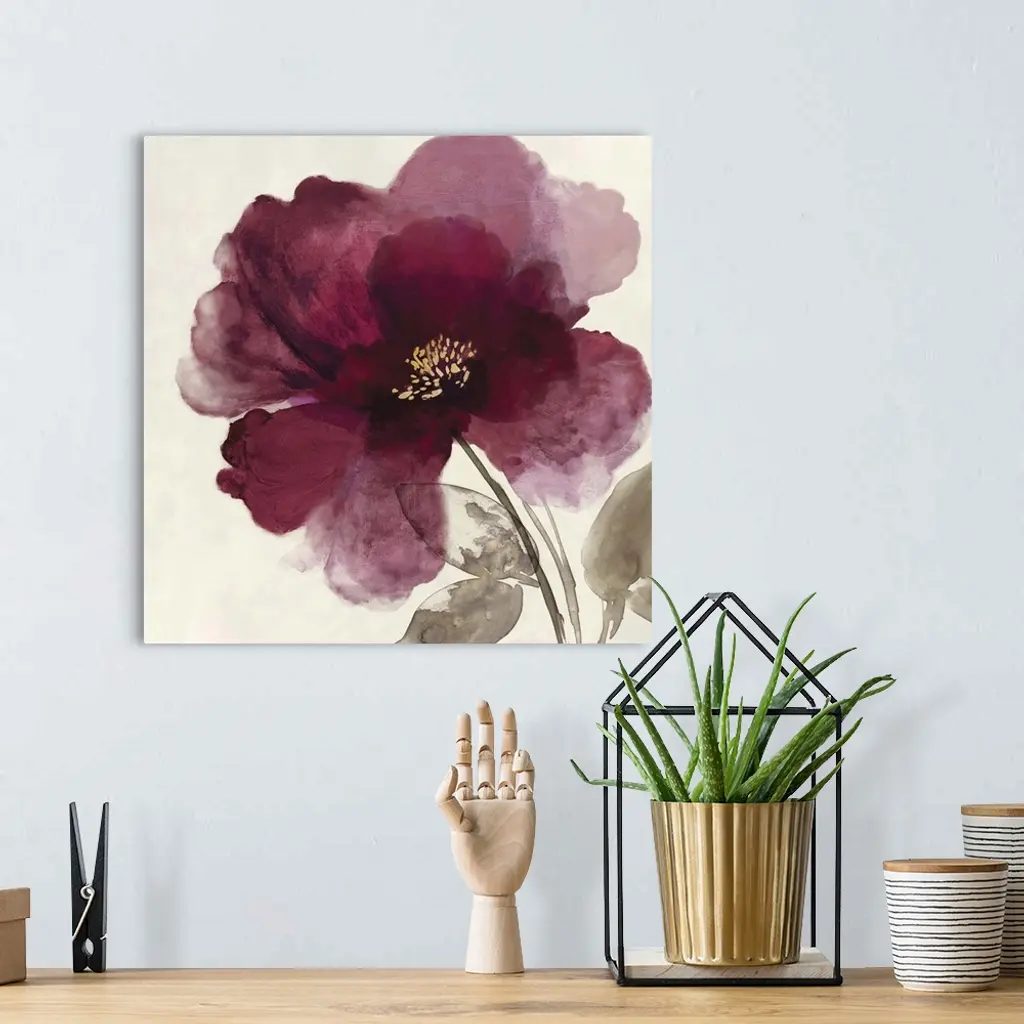 Square watercolor painting of a blooming peony with deep red petals on a beige background.