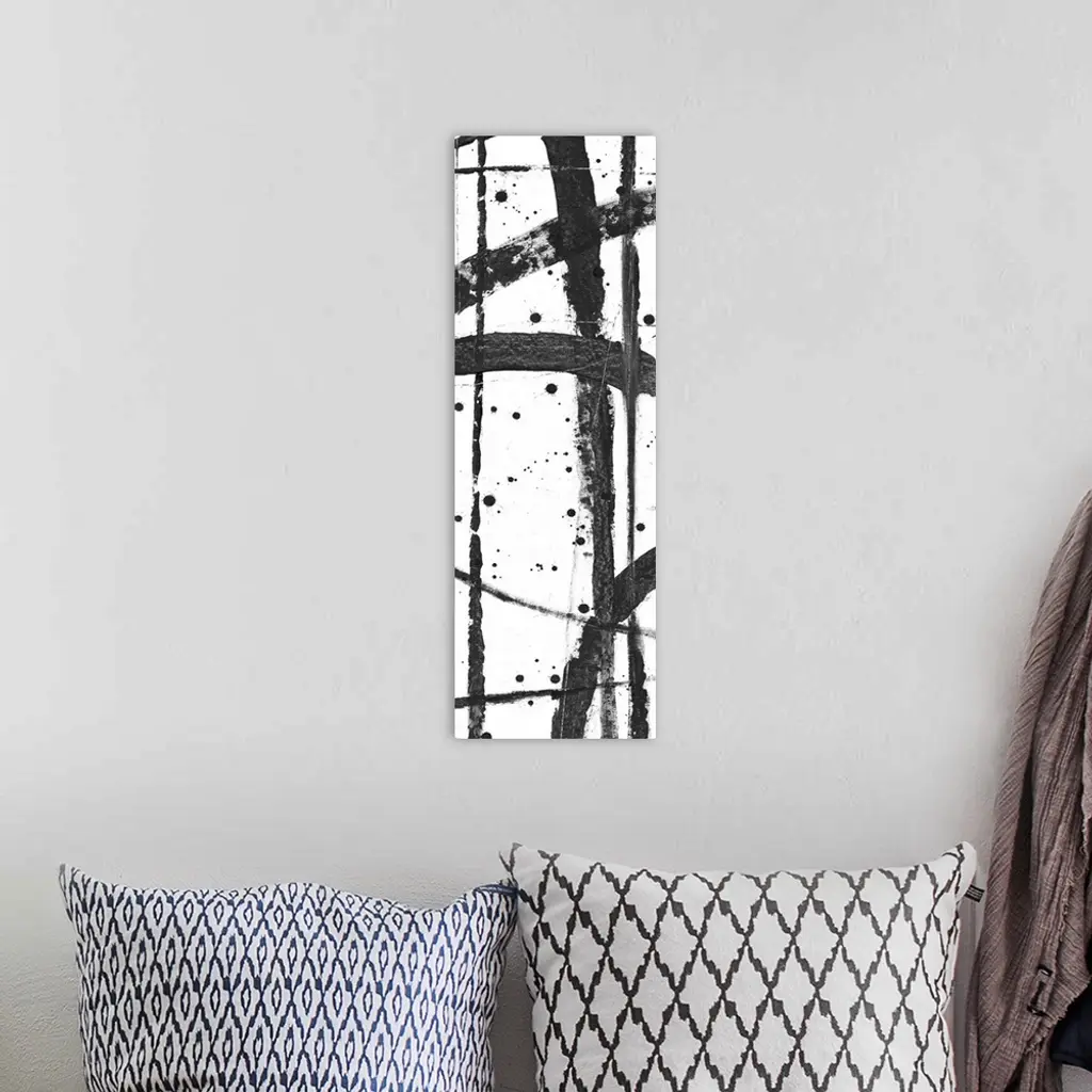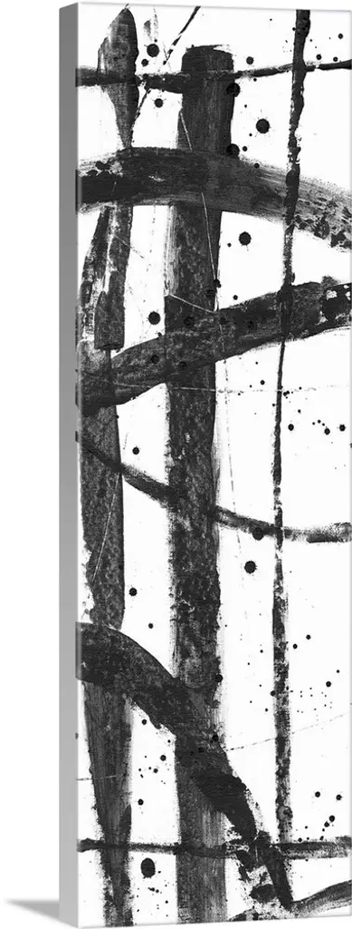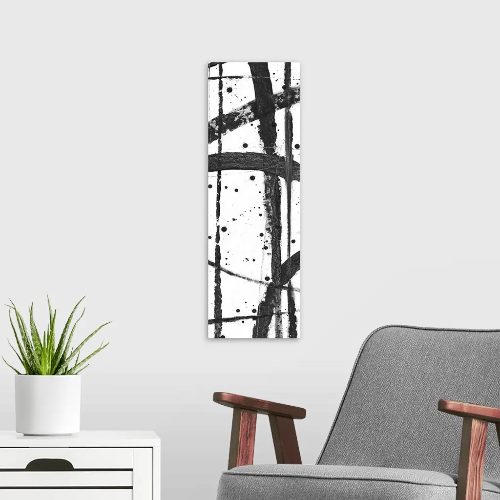 Contemporary abstract painting with criss-crossing black lines on a white background.