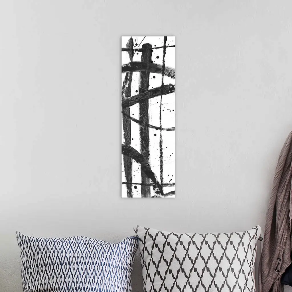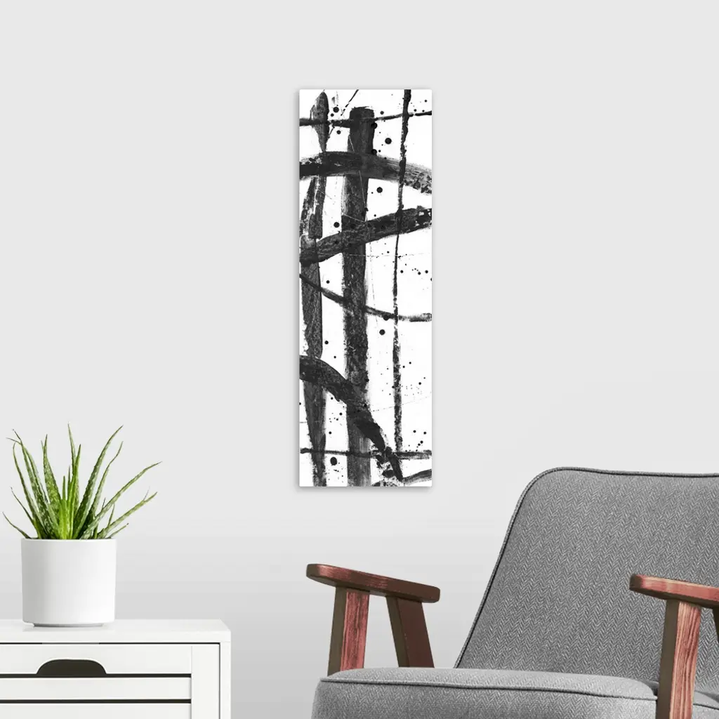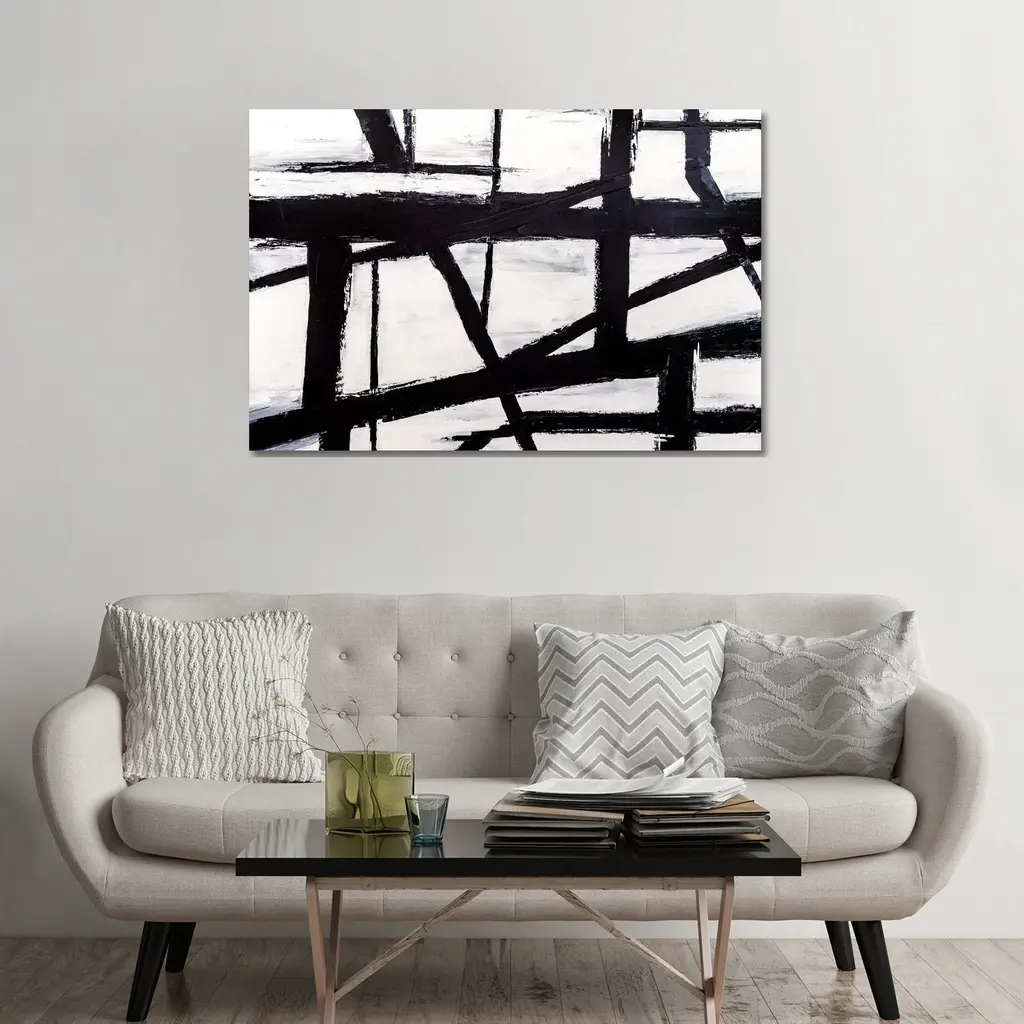 Contemporary abstract painting with criss-crossing black lines on a white background.