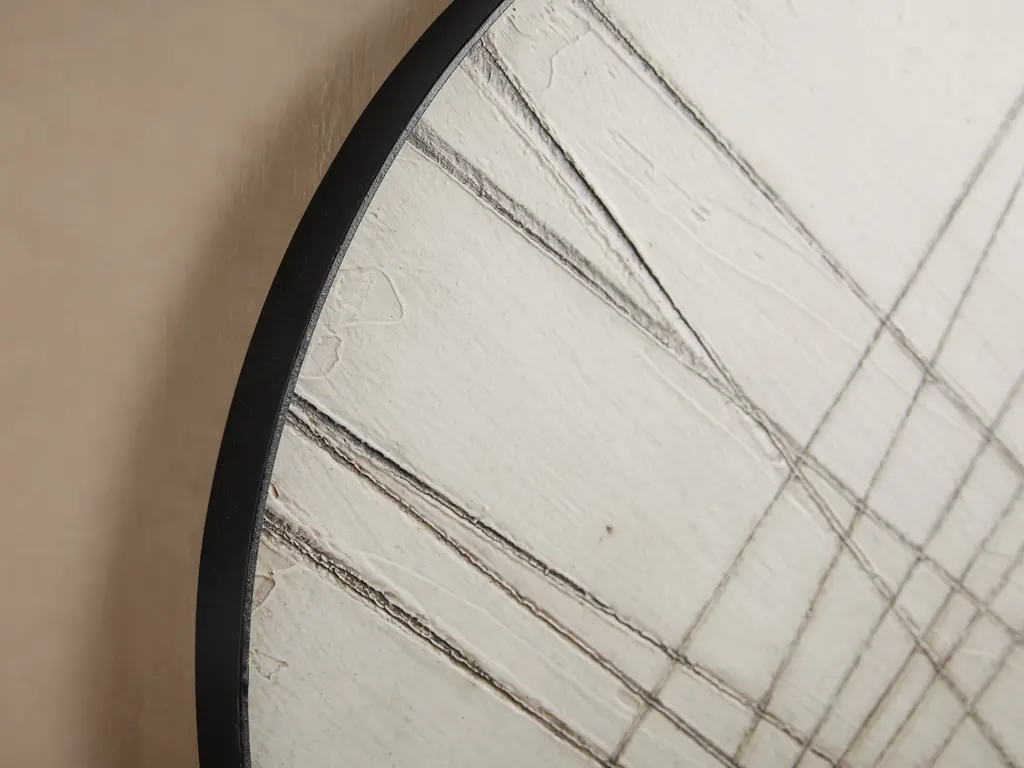 Criss Cross is striking as it is unique. Bold, textural patterns are created on Italian resin cement, and then hand-finished in shades of parchment. Encased inside a circular, hand-welded iron frame, this truly one-of-a-kind piece adds energy and movement to any living space. Handcrafted on Italian resin cement. Encased inside a hand-welded iron frame. Hangs from back-mounted hardware. Artist Dawn Sweitzer.