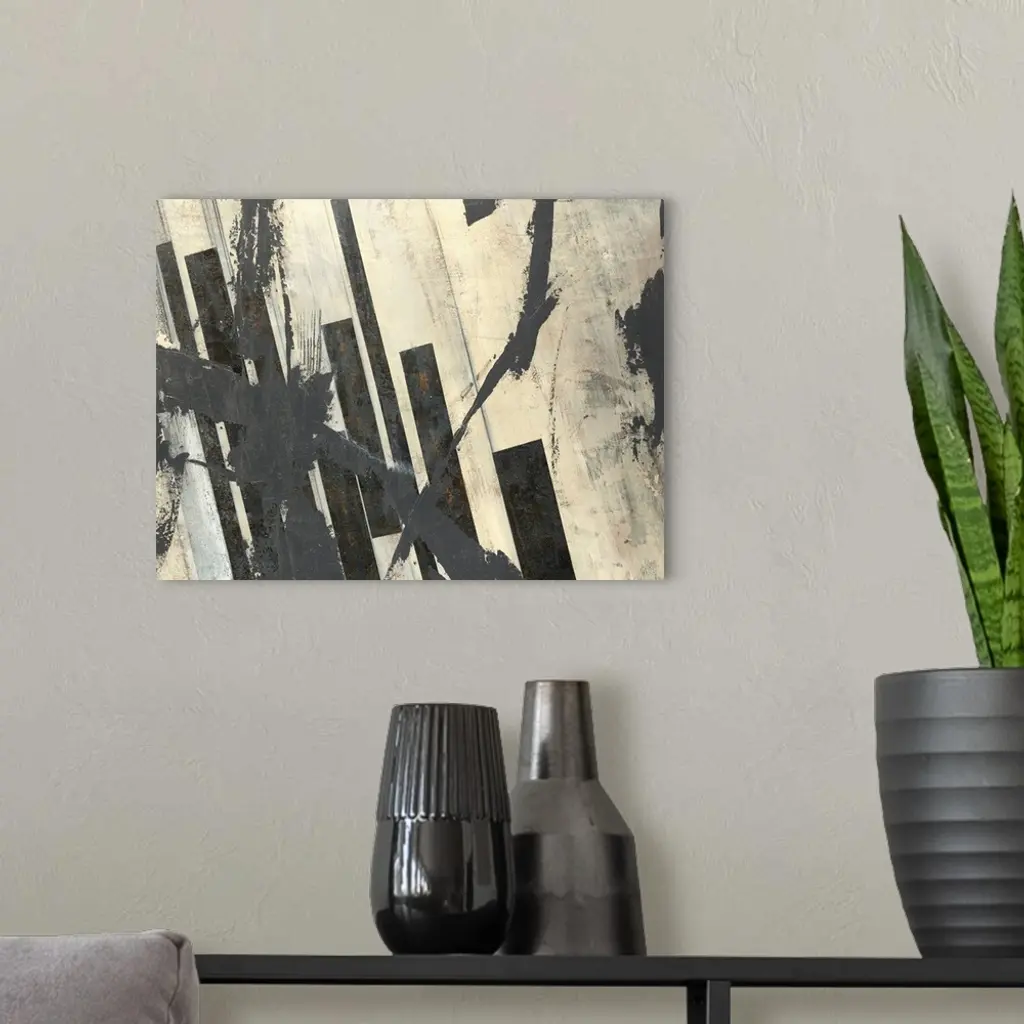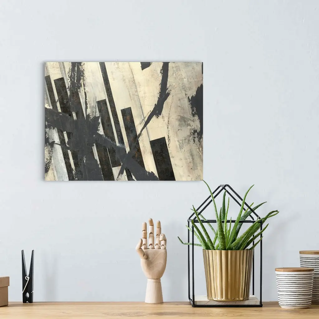 Abstract artwork with splashes of black paint on an off white background with thick black bars also going diagonally on the print.