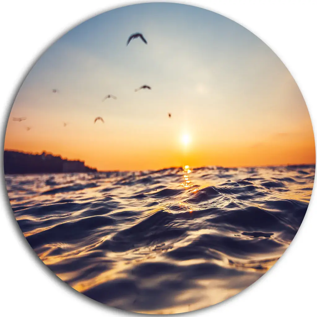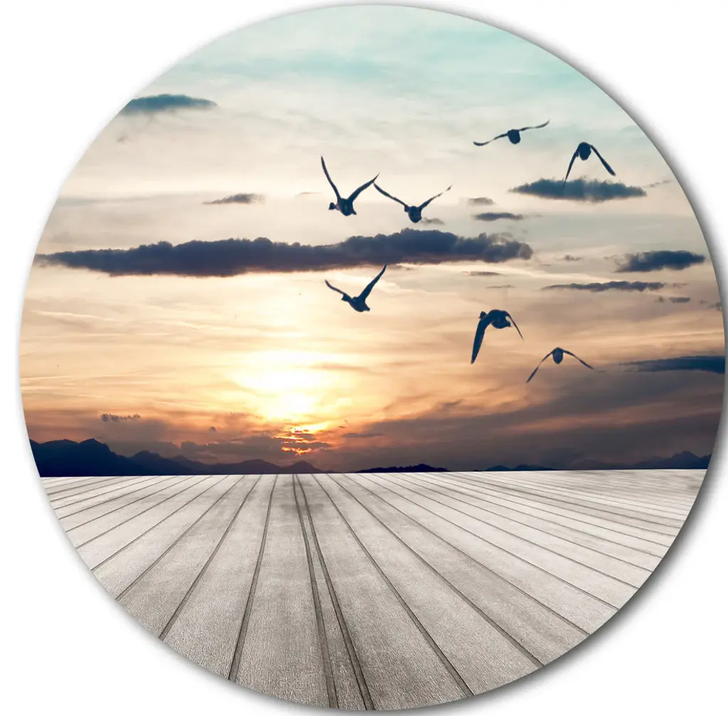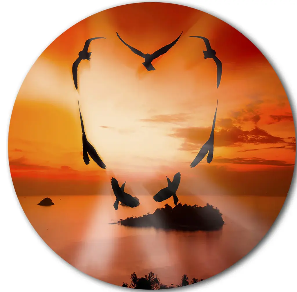 Bring Contemporary Abstraction to your home with this large Circle Metal wall art. This Crow Heart at Sunset Metal Artwork makes it the focal point of any room or office. - White Gloss Coating ensures colors are extra vibrant with light reflection.- Aluminum grade Sheet Metal with 1 inch mounting frame on the back giving the illusion that the artwork is floating on the wall..- Mounting Brackets are included along with instructions.- High Quality Digital images are created directly into a glossy aluminum panel producing a stunning and captivating print into the glossy finish of the metal.- Water, Fire and Scratch resistant HD Aluminum panels.- Looks better than any photo paper and guaranteed to last at least 20 years- Easy to clean with a microfiber cloth. Colors are far superior to regular Canvas Art. - Easy to Hang