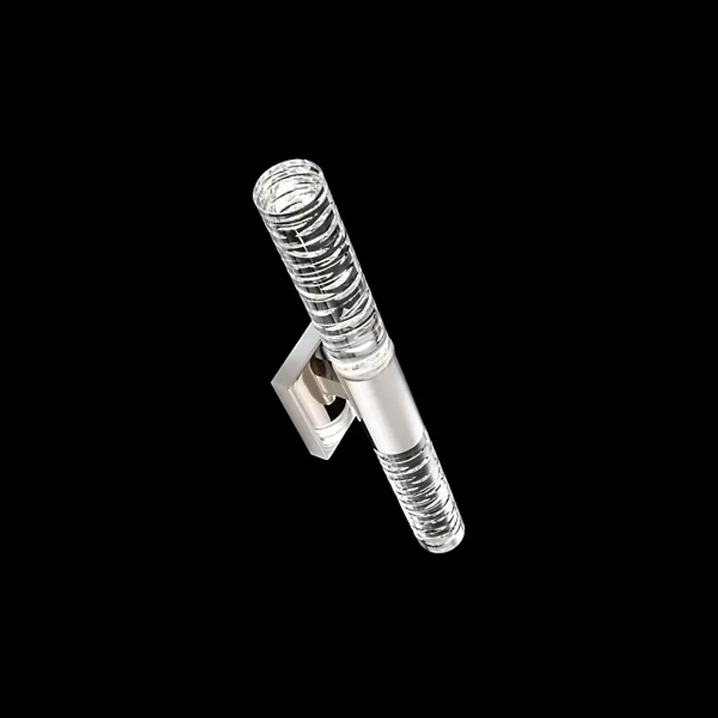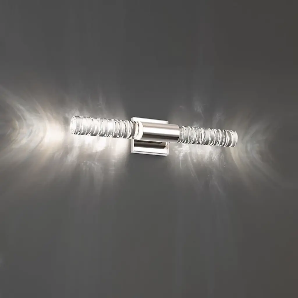 The Cru LED Vanity Light from Schonbek Beyond keeps the contemporary bathroom’s clean aesthetic in check with minimalist forms designed for optimal light diffusion. By keeping its shapes understated, the bath bar physically slots into tight spaces and visually allows the personality of the materials to stand out. Here, compact geometric hardware says sophistication with a metallic finish. Clear glass rod diffusers invite one to come closer to admire their rolling texture. These textural marks shimmer when turned on. Light streaming from the center exits as a uniform glow suited for the daily routine.