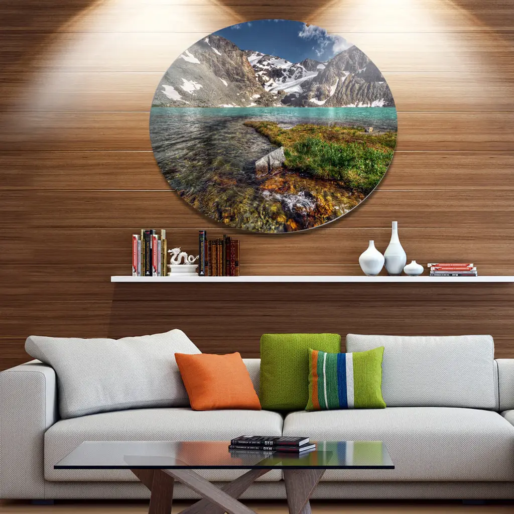 Bring Contemporary Abstraction to your home with this large Circle Metal wall art. This Crystal Clear Creek in Mountains Metal Artwork makes it the focal point of any room or office. - White Gloss Coating ensures colors are extra vibrant with light reflection.- Aluminum grade Sheet Metal with 1 inch mounting frame on the back giving the illusion that the artwork is floating on the wall..- Mounting Brackets are included along with instructions.- High Quality Digital images are created directly into a glossy aluminum panel producing a stunning and captivating print into the glossy finish of the metal.- Water, Fire and Scratch resistant HD Aluminum panels.- Looks better than any photo paper and guaranteed to last at least 20 years- Easy to clean with a microfiber cloth. Colors are far superior to regular Canvas Art. - Easy to Hang