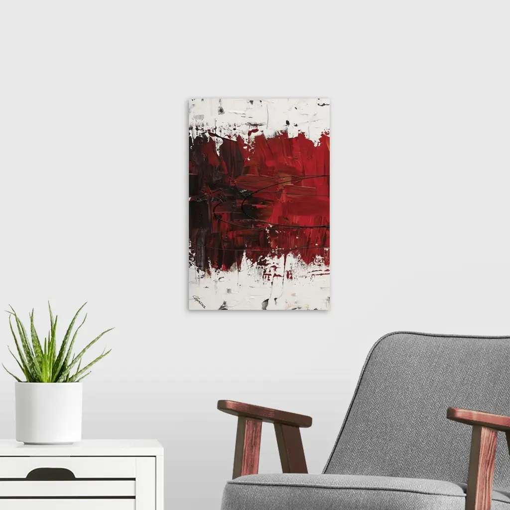 Abstract painting with thick layering and textures in a red gradient and white on the top and bottom with black markings.