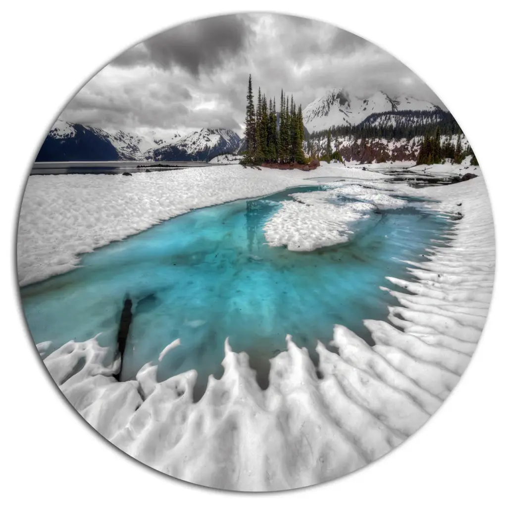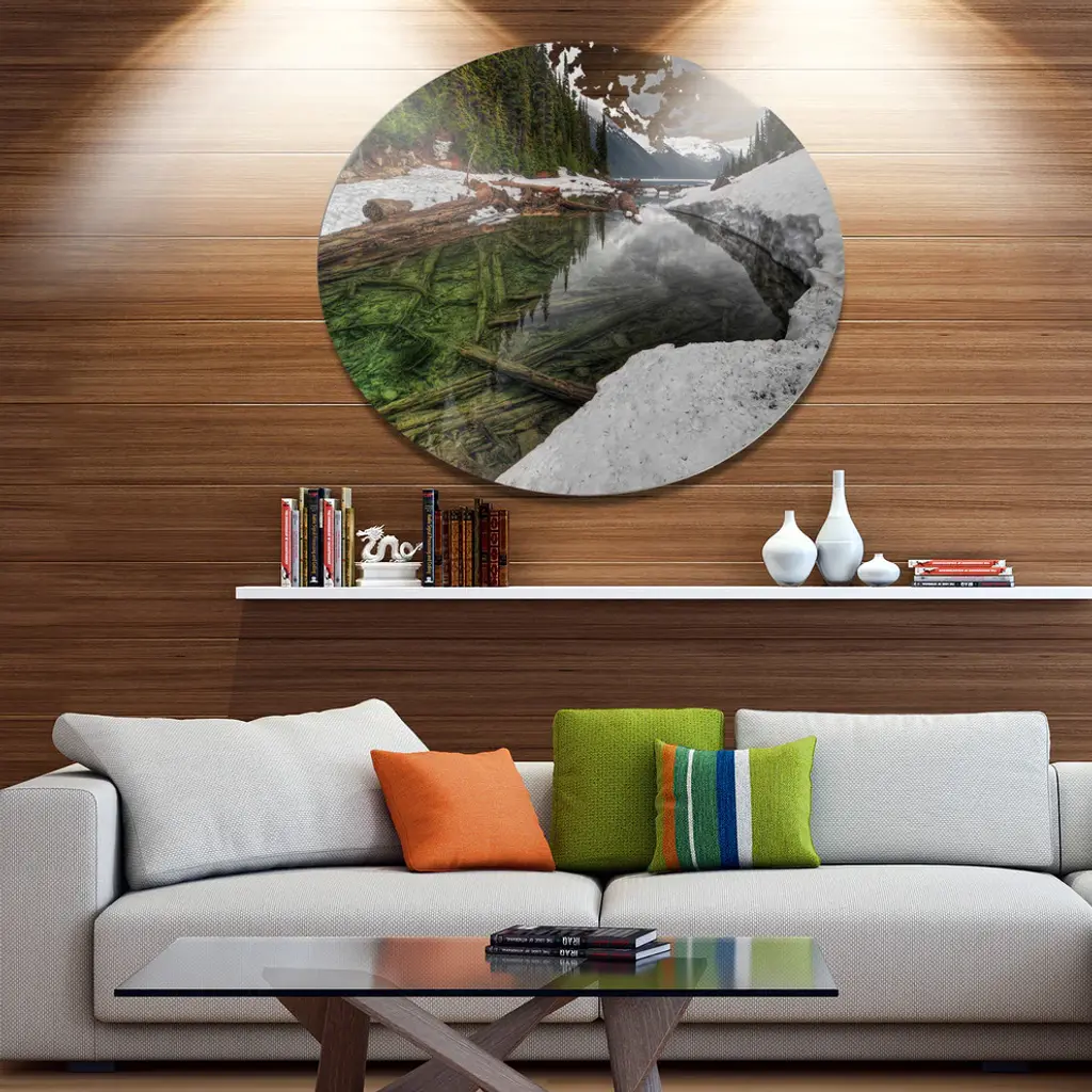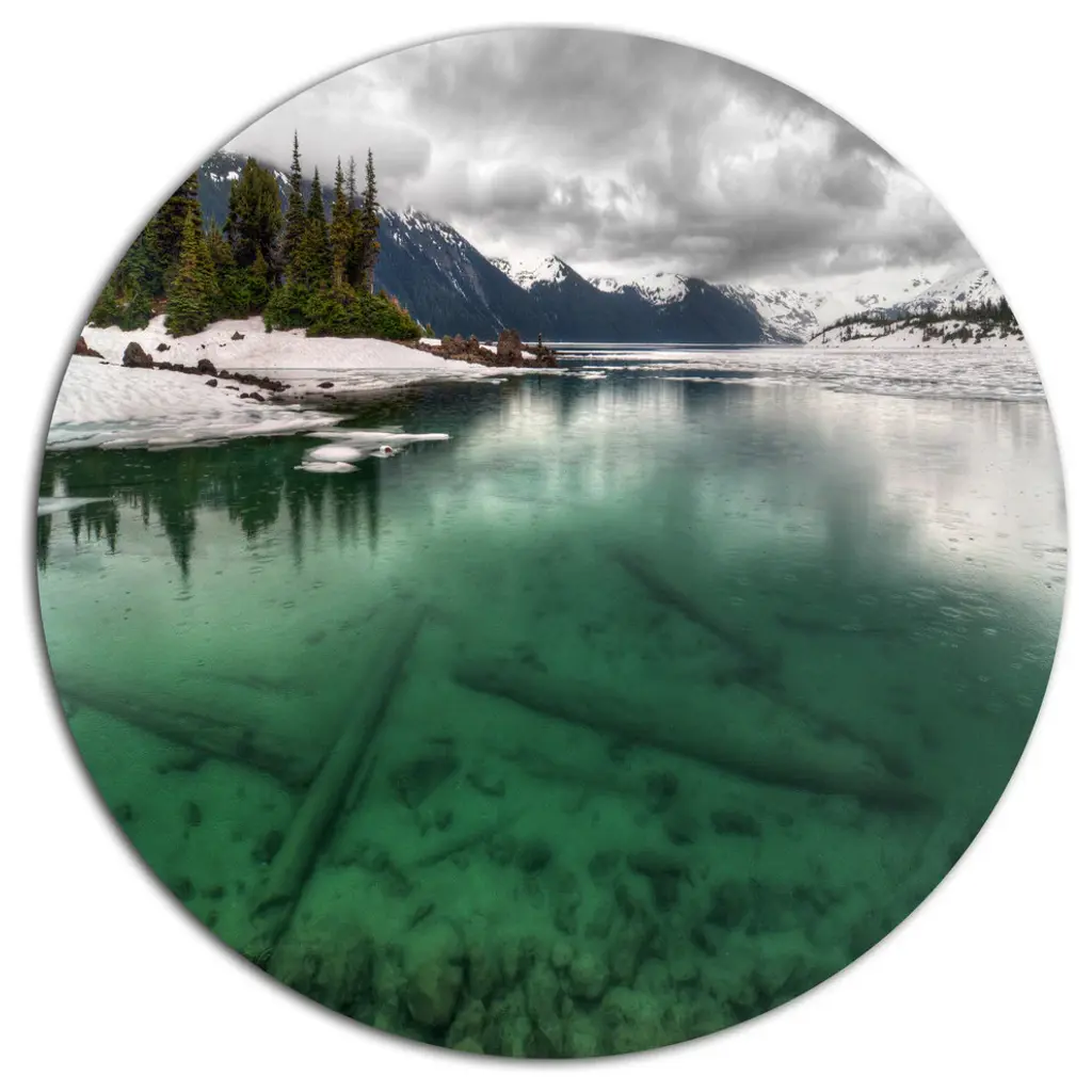 Bring Contemporary Abstraction to your home with this large Circle Metal wall art. This Crystal Clear Lake with Pine Trees Metal Artwork makes it the focal point of any room or office. - White Gloss Coating ensures colors are extra vibrant with light reflection.- Aluminum grade Sheet Metal with 1 inch mounting frame on the back giving the illusion that the artwork is floating on the wall..- Mounting Brackets are included along with instructions.- High Quality Digital images are created directly into a glossy aluminum panel producing a stunning and captivating print into the glossy finish of the metal.- Water, Fire and Scratch resistant HD Aluminum panels.- Looks better than any photo paper and guaranteed to last at least 20 years- Easy to clean with a microfiber cloth. Colors are far superior to regular Canvas Art. - Easy to Hang