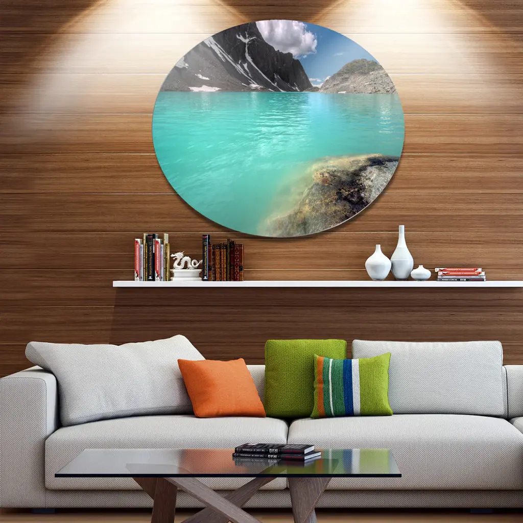 Bring Contemporary Abstraction to your home with this large Circle Metal wall art. This Crystal Clear Mountain Lake Metal Artwork makes it the focal point of any room or office. - White Gloss Coating ensures colors are extra vibrant with light reflection.- Aluminum grade Sheet Metal with 1 inch mounting frame on the back giving the illusion that the artwork is floating on the wall..- Mounting Brackets are included along with instructions.- High Quality Digital images are created directly into a glossy aluminum panel producing a stunning and captivating print into the glossy finish of the metal.- Water, Fire and Scratch resistant HD Aluminum panels.- Looks better than any photo paper and guaranteed to last at least 20 years- Easy to clean with a microfiber cloth. Colors are far superior to regular Canvas Art. - Easy to Hang