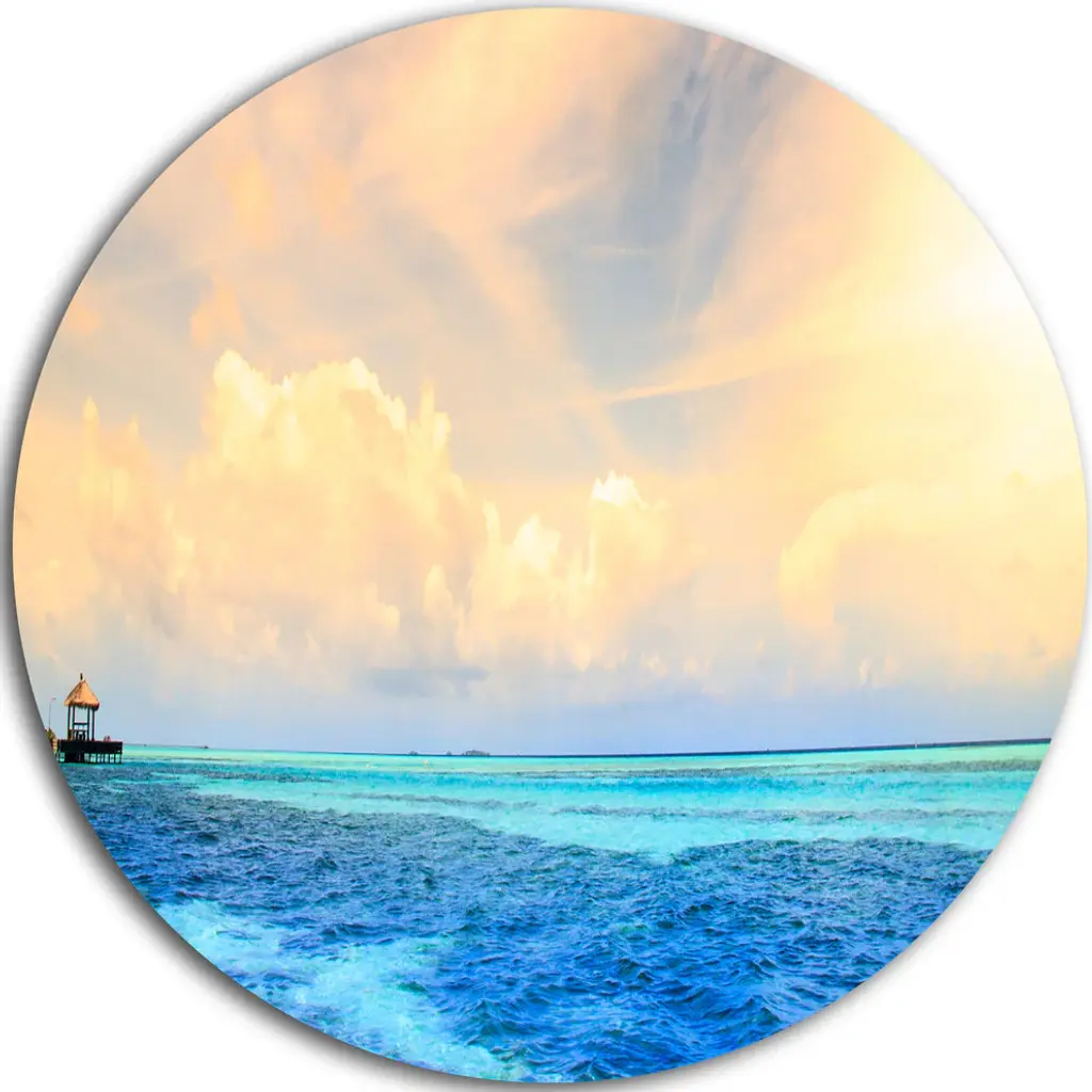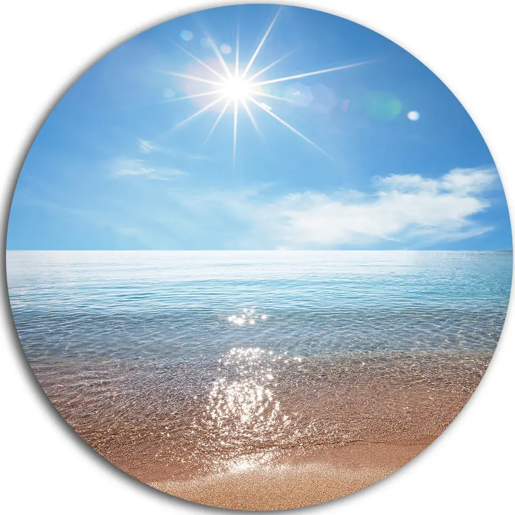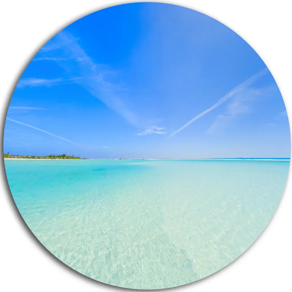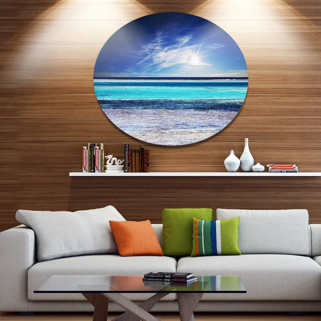 Bring Contemporary Abstraction to your home with this large Circle Metal wall art. This Crystal Clear Sea under Sunlight Metal Artwork makes it the focal point of any room or office. - White Gloss Coating ensures colors are extra vibrant with light reflection.- Aluminum grade Sheet Metal with 1 inch mounting frame on the back giving the illusion that the artwork is floating on the wall..- Mounting Brackets are included along with instructions.- High Quality Digital images are created directly into a glossy aluminum panel producing a stunning and captivating print into the glossy finish of the metal.- Water, Fire and Scratch resistant HD Aluminum panels.- Looks better than any photo paper and guaranteed to last at least 20 years- Easy to clean with a microfiber cloth. Colors are far superior to regular Canvas Art. - Easy to Hang
