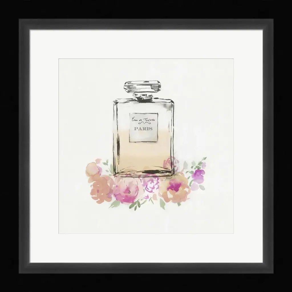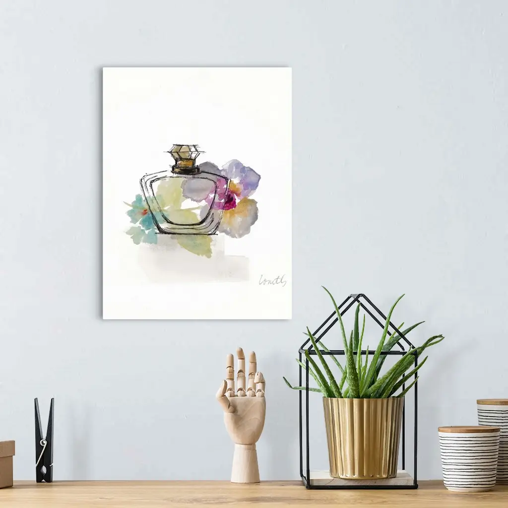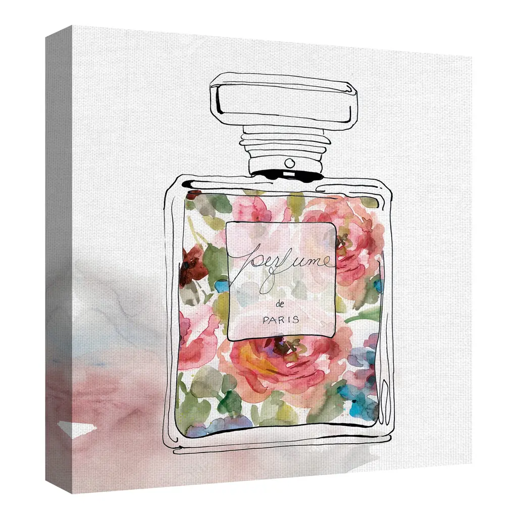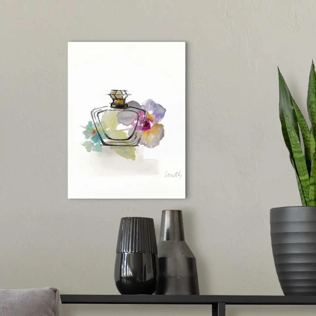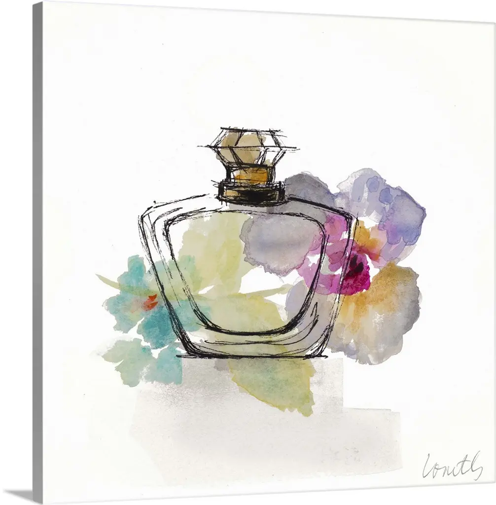 Watercolor painting of a perfume bottle with colorful flowers in the background.