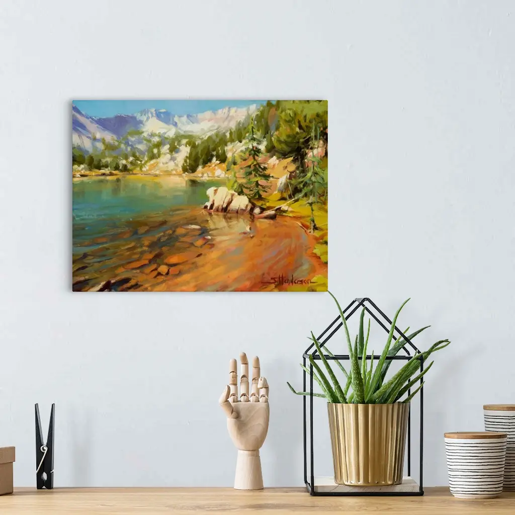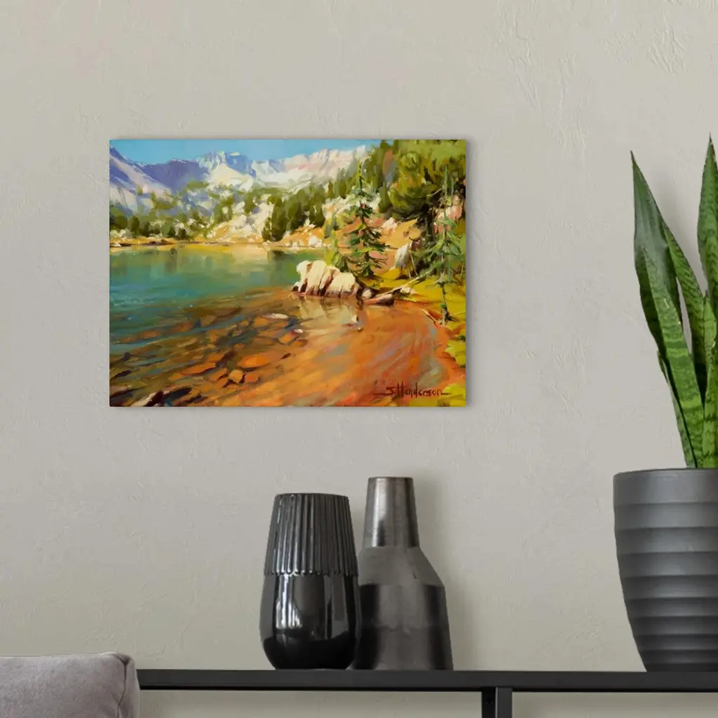 Traditional impressionist landscape painting of an alpine wilderness lake. It is calm, quiet, and peaceful.