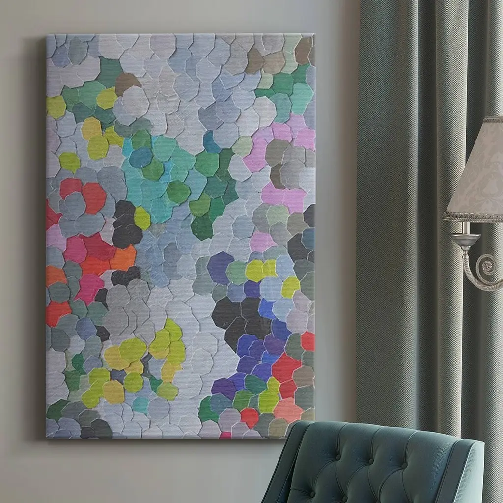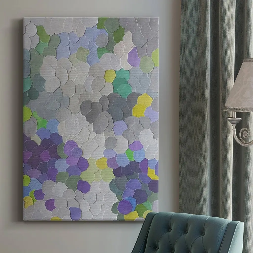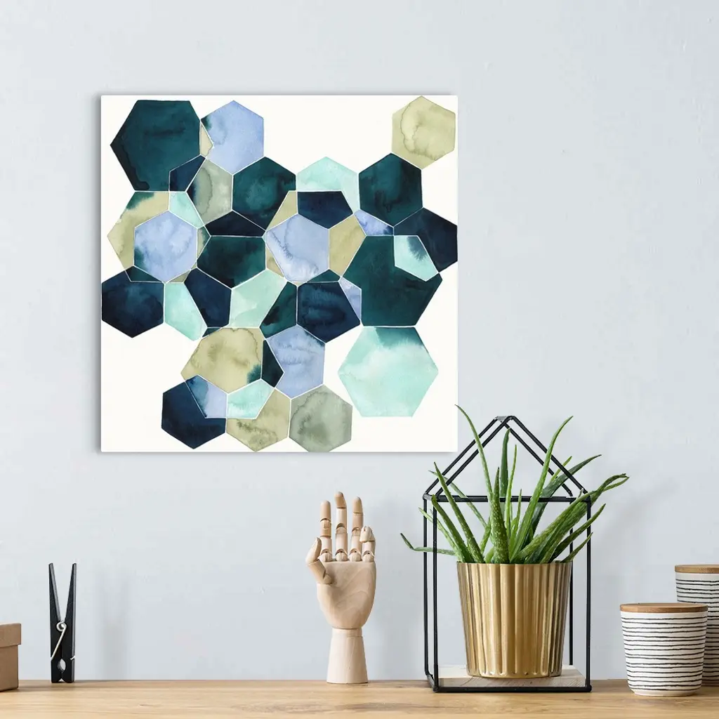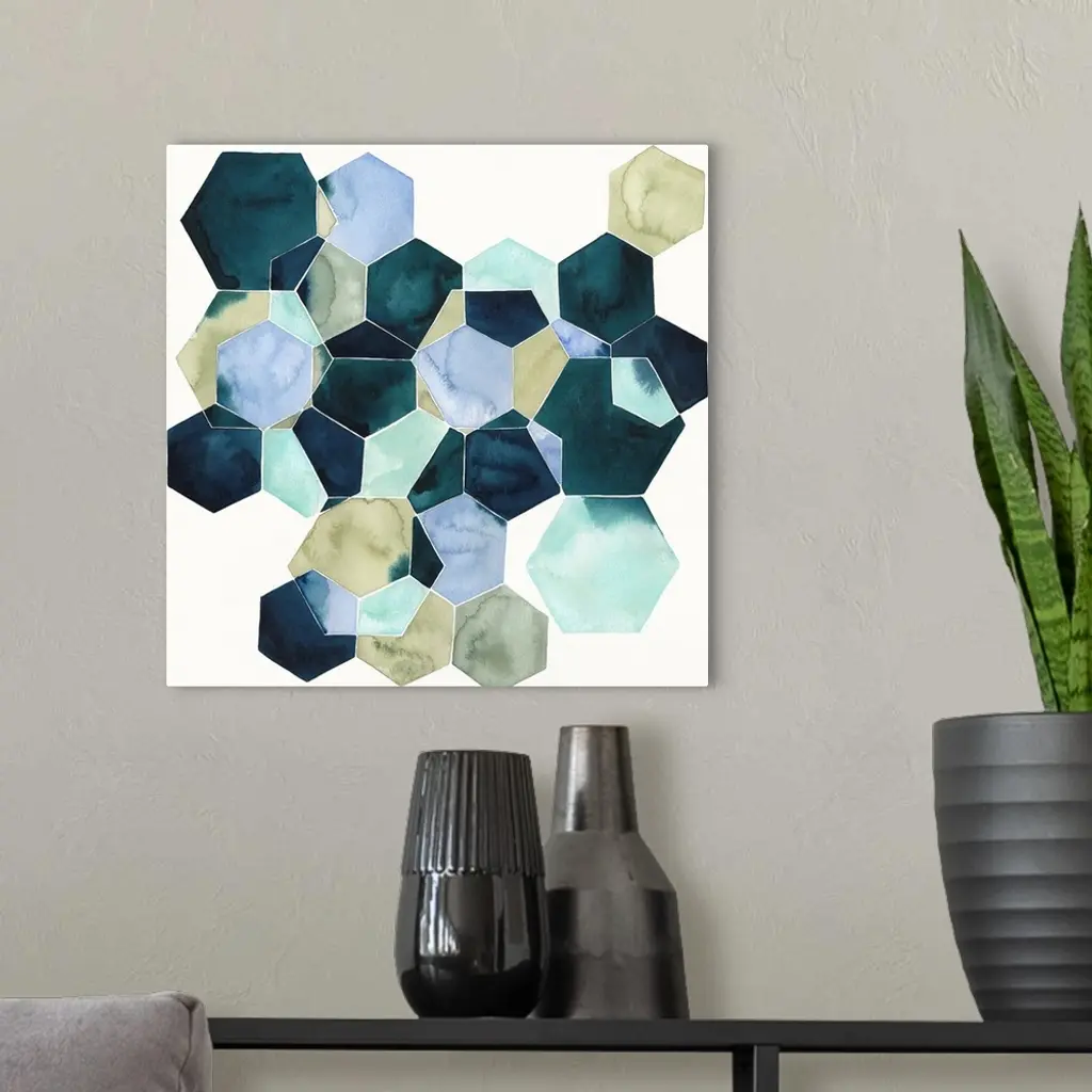 Watercolor geometric painting of intersecting hexagons in blue tones.