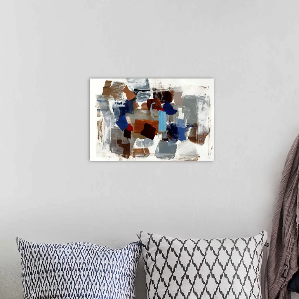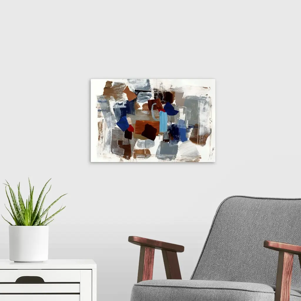 Horizontal contemporary painting of square shapes in natural colors.
