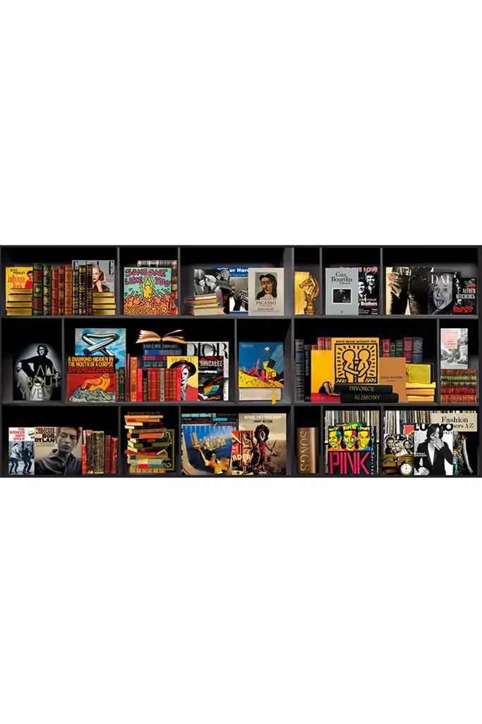 Printed onto sleek plexiglass, this vibrant artwork by Andrew Martin brings together an eclectic mix of cultural touchstones in an eclectic bookshelf. Record covers from various musical genres, sit alongside big fashion house names and vintage-inspired leather-bound books to create a bold and graphic piece.