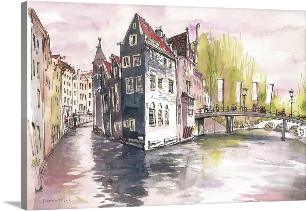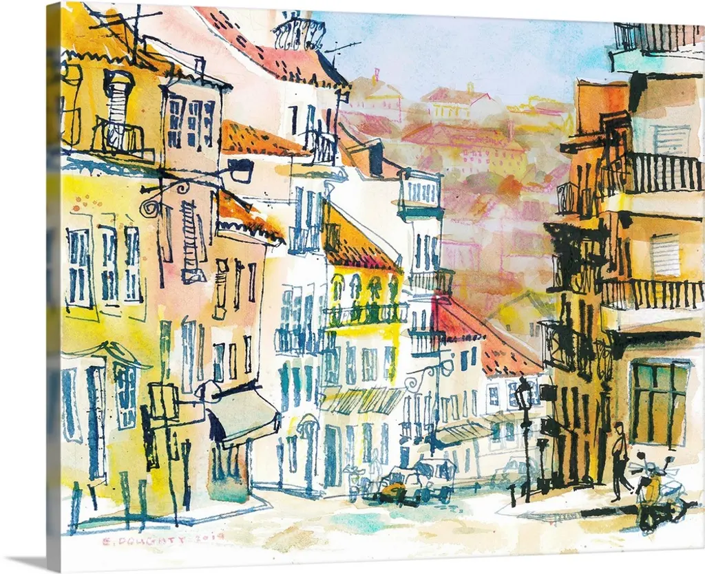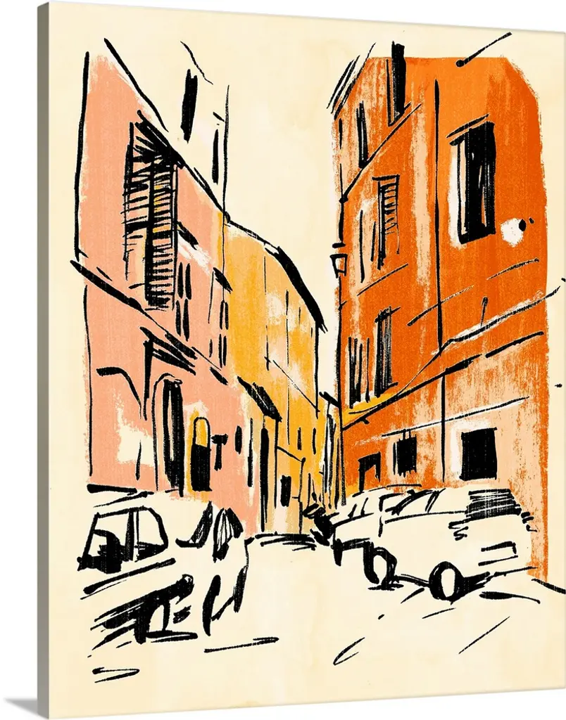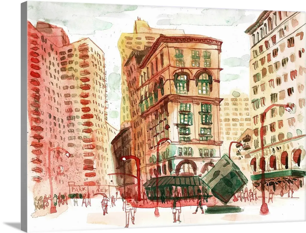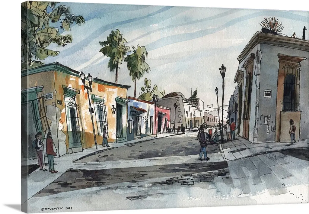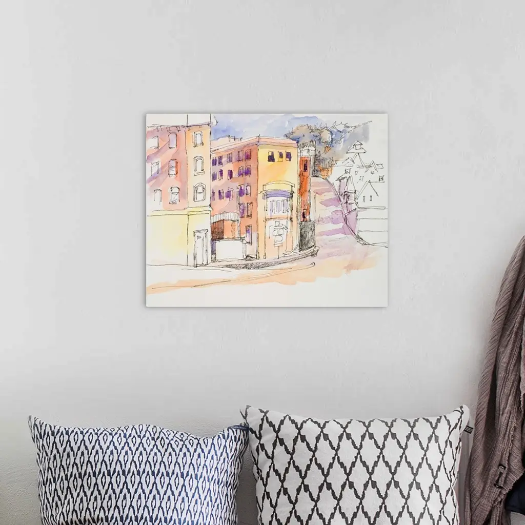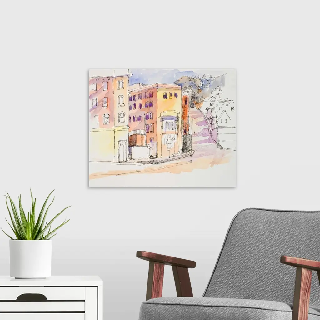 Watercolor and ink painting of a street corner.