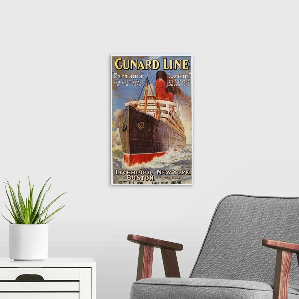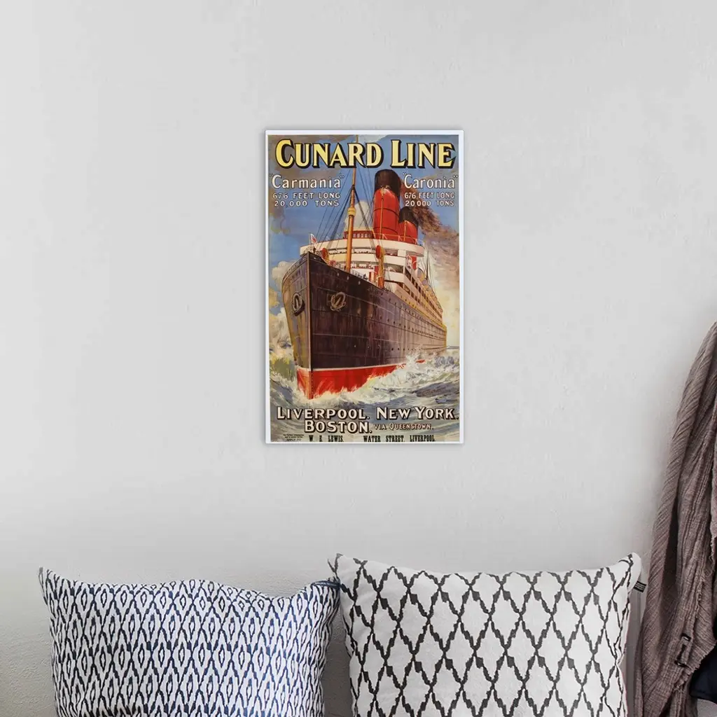Poster from 1905, advertising the Carmania and Caronia ocean liners. Service to Liverpool, Boston, New York, via Queenstown.