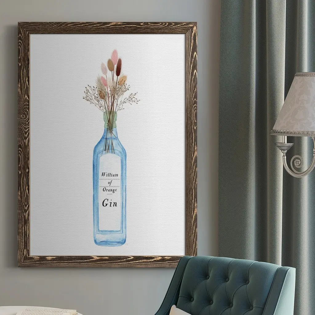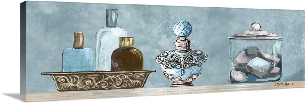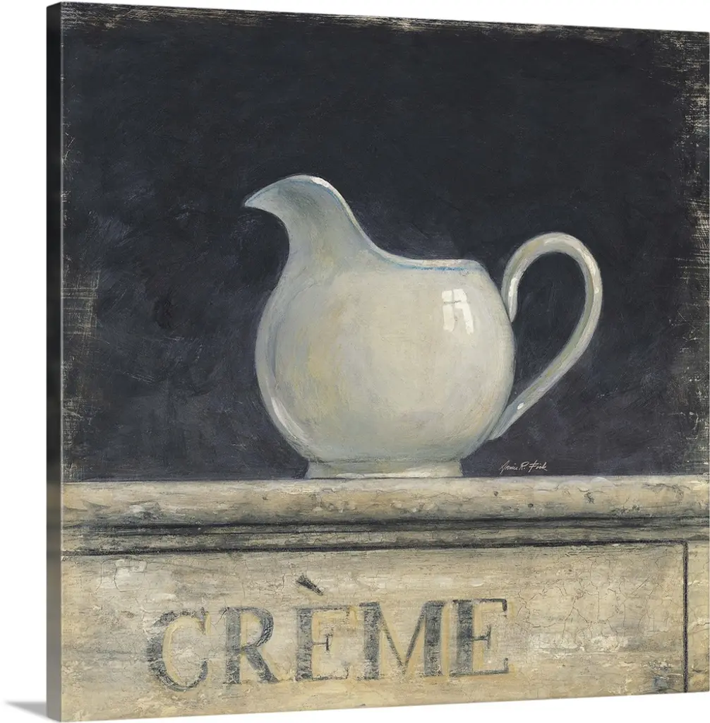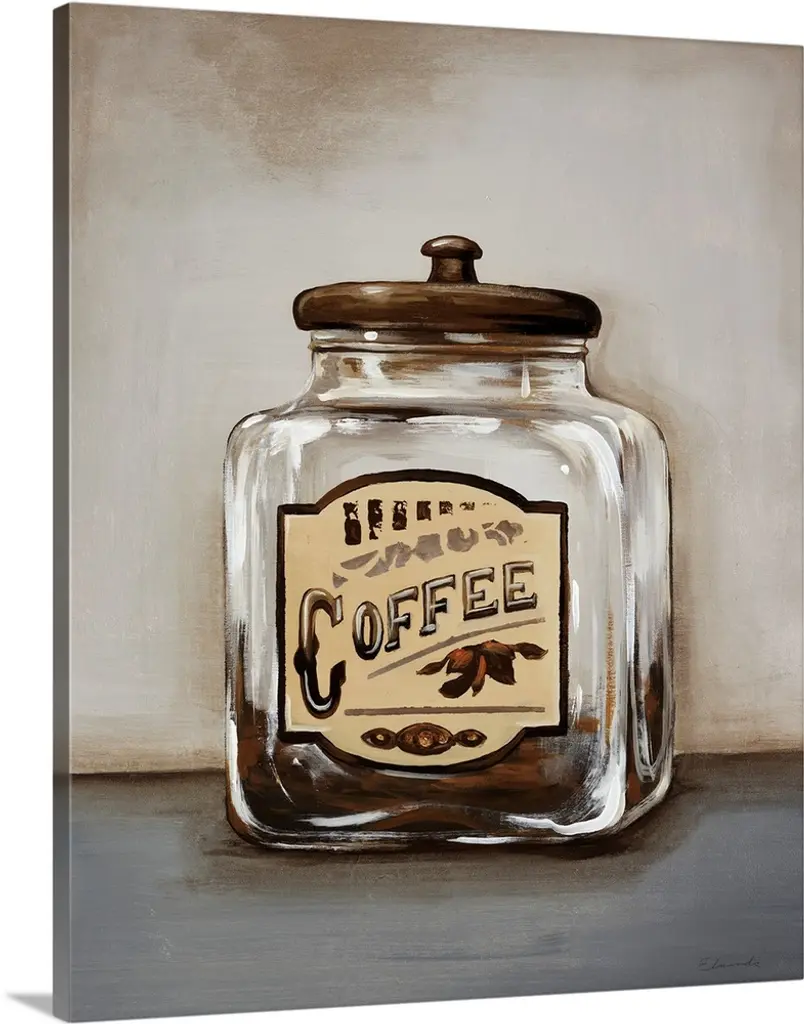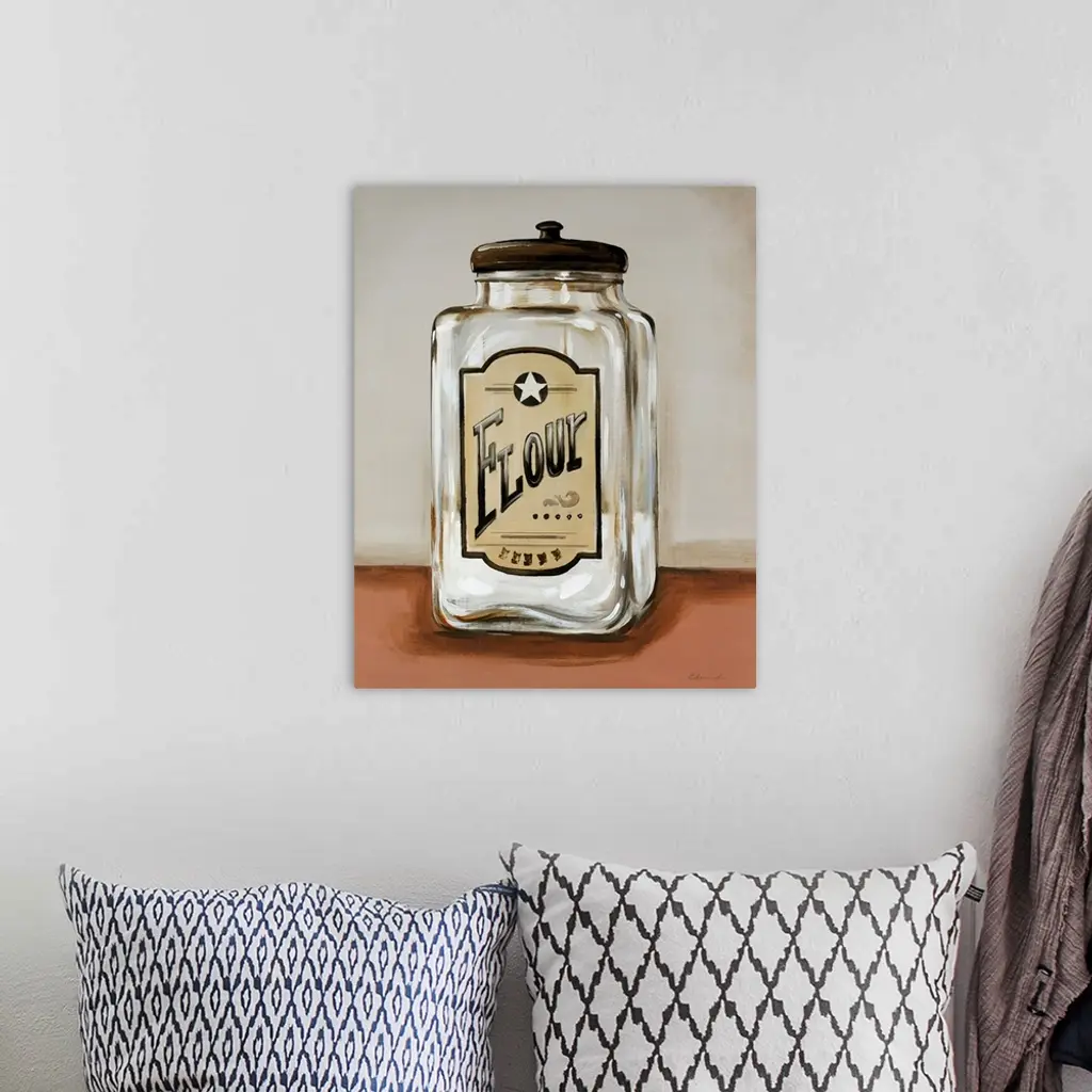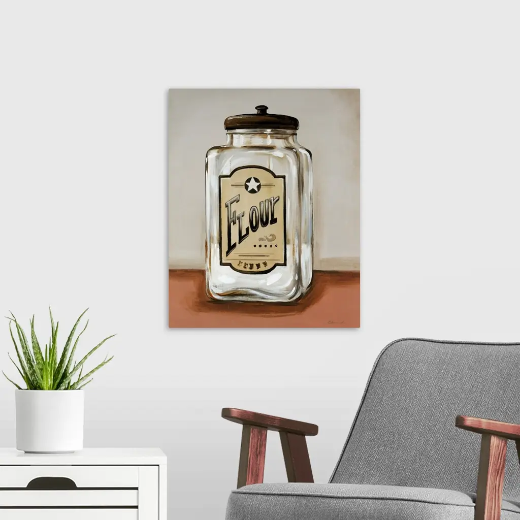 Painting of a partially full clear glass storage jar with a vintage flour label on the front, sitting on a bare counter in front of a wall.
