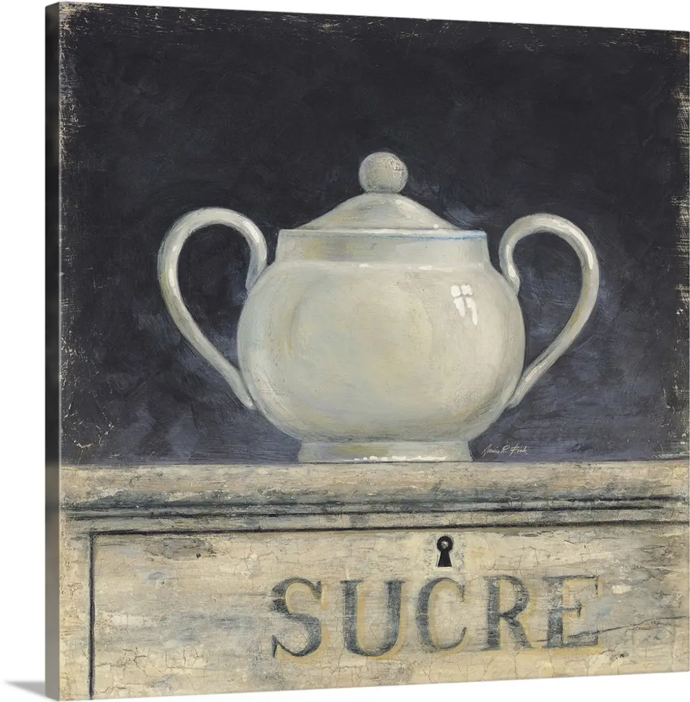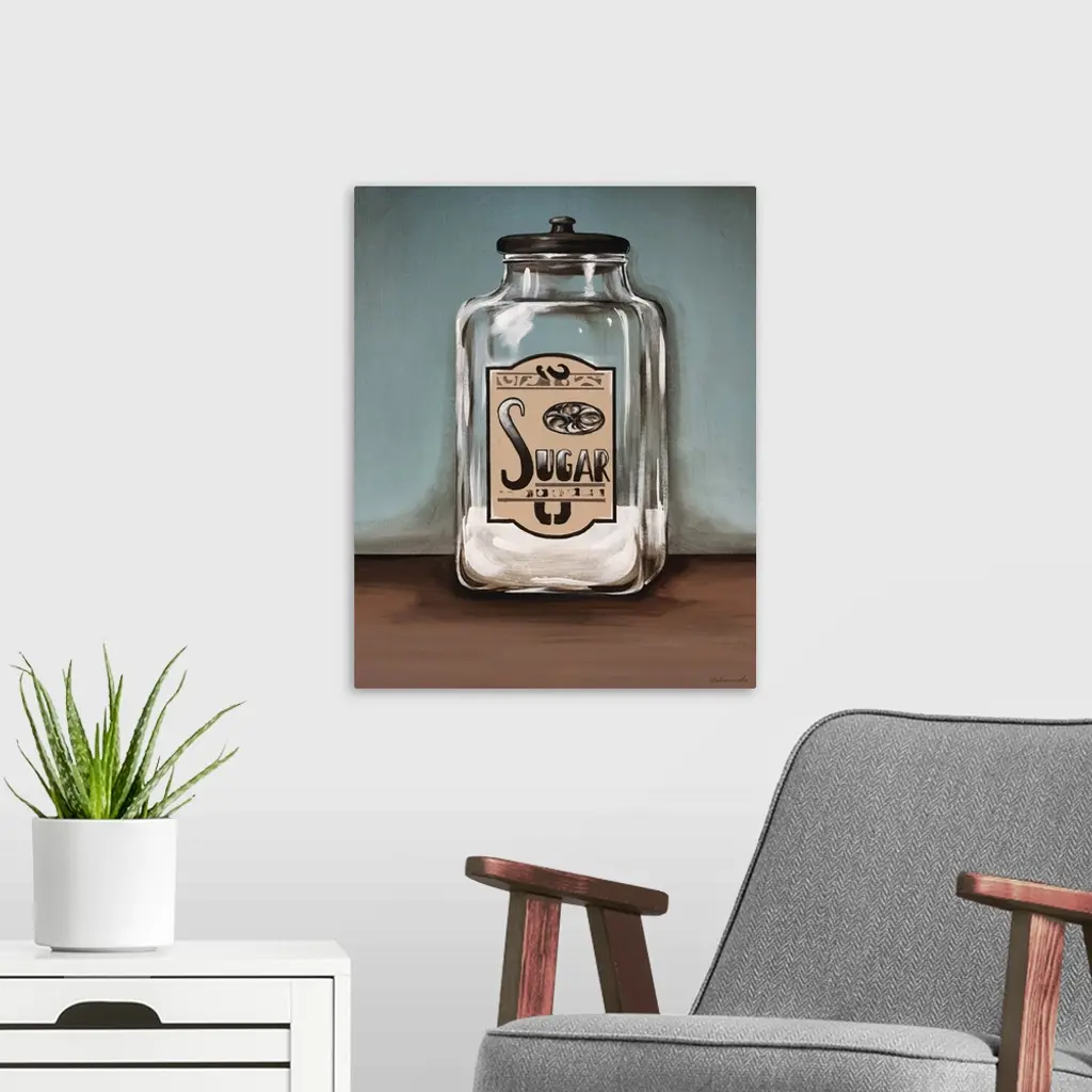 Contemporary painting of a glass jar with sugar in it sitting on a table surface.
