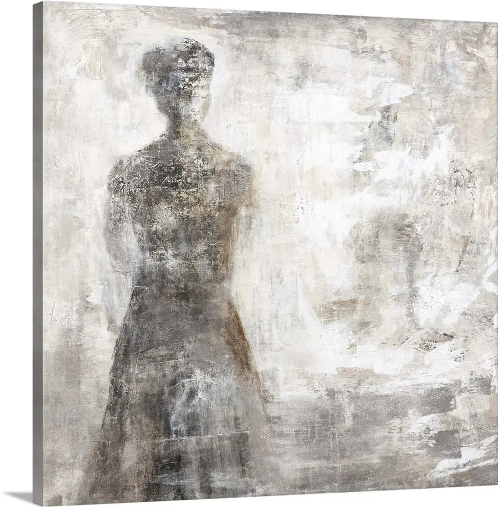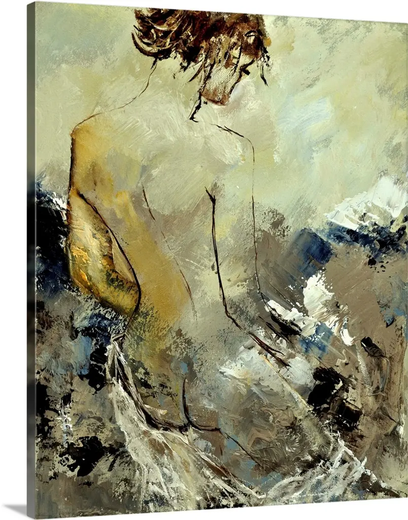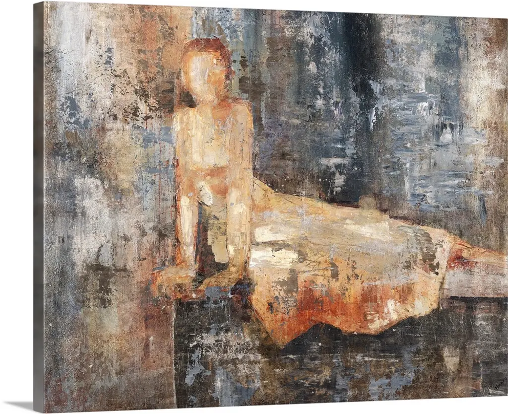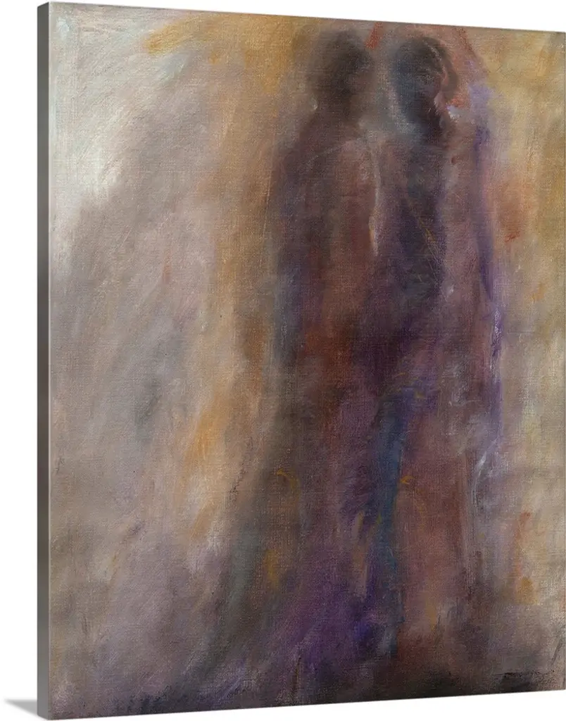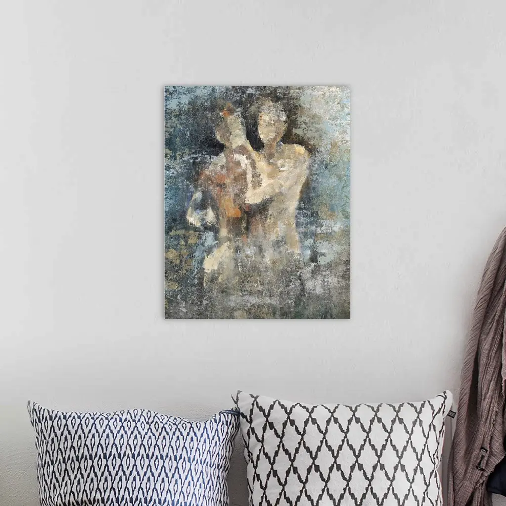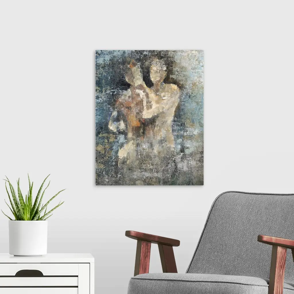 Contemporary abstract painting of two figures holding each other nude with textured paint surrounding them in shades of blue, gray, and gold.