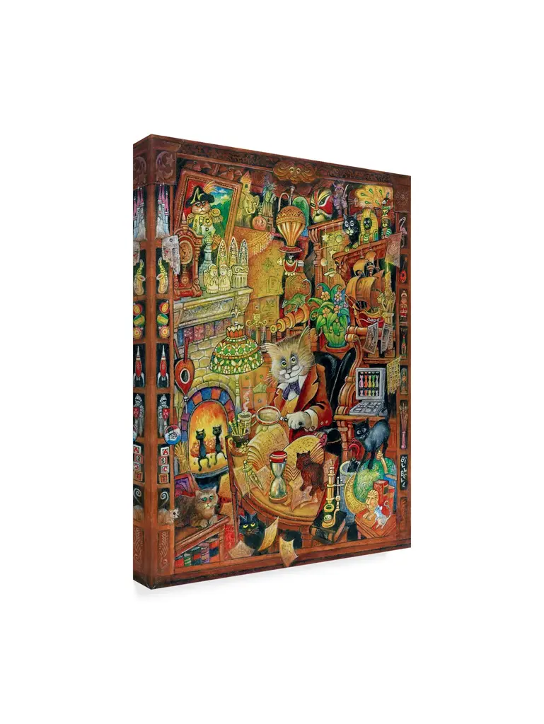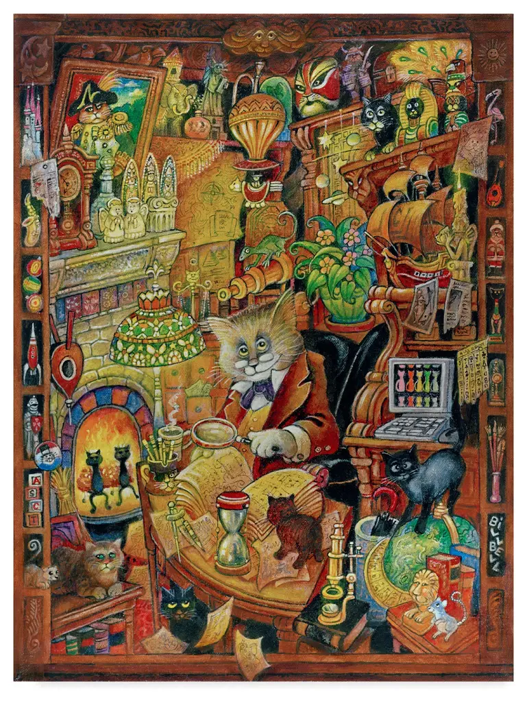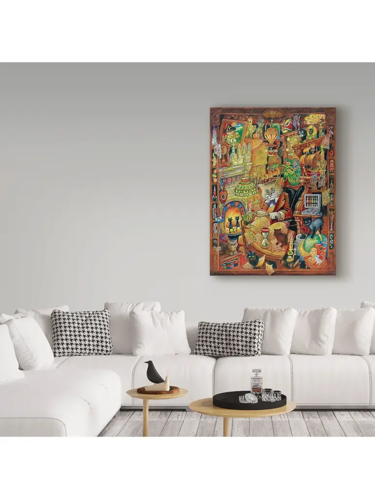 Artist: Bill BellSubject: FantasyStyle: EclecticProduct Type: Gallery-Wrapped Canvas ArtMade in USAThis ready to hang, gallery-wrapped art piece features a cat sitting in a chair in the center of a messy room.A native of Philadelphia, Bill Bell is a completely self taught artist who took up painting full-time in 1982 after a successful career as a musician and record company executive. For Bill, painting is a compulsion, it is also my fun, my therapy, and my challenge. Working in brilliant acrylics, he creates richly detailed and visually complex scenes based on memories and impressions of people, pets, events, and dreams that have shaped his life. His unique and enchanting designs have been reproduced as prints, posters, greeting cards, T shirts, puzzles, childrens books, album covers and several series of collectors plates for the Franklin Mint.Giclee (jee-clay) is an advanced printmaking process for creating high quality fine art reproductions. The attainable excellence that Giclee printmaking affords makes the reproduction virtually indistinguishable from the original piece. The result is wide acceptance of Giclee by galleries, museums, and private collectors. Gallery wrap is a method of stretching an artist's canvas so that the canvas wraps around the sides and is secured a hidden, wooden frame. This method of stretching and preparing a canvas allows for a frameless presentation of the finished painting.Materials: Canvas: 100% Cotton, Stretcher Bars: Poplar