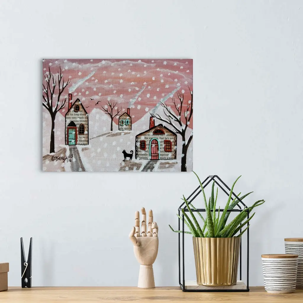 A contemporary folk art style painting of a rolling countryside landscape.