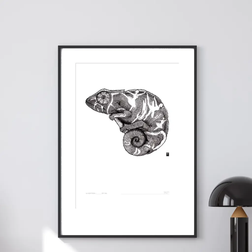 The Curious Chameleon - A3 Limited Edition Print is hand-drawn using fine ink pens. At the center of the print is a curious chameleon, a symbol of inquisitiveness, depicted in a state of wonder. The chameleon is surrounded by hidden gems, cleverly concealed within the artwork, waiting to be discovered by the viewer. With each new glance, more details will be revealed, making this print an engaging and interactive experience.WHAT CAN YOU SEE?There are 5 hidden gems to find.Hint: [ Ballerinas | Cockerel | Elephant ]The more you relax, the more you will start to see.Happy looking.Limited 1st Edition of 100.