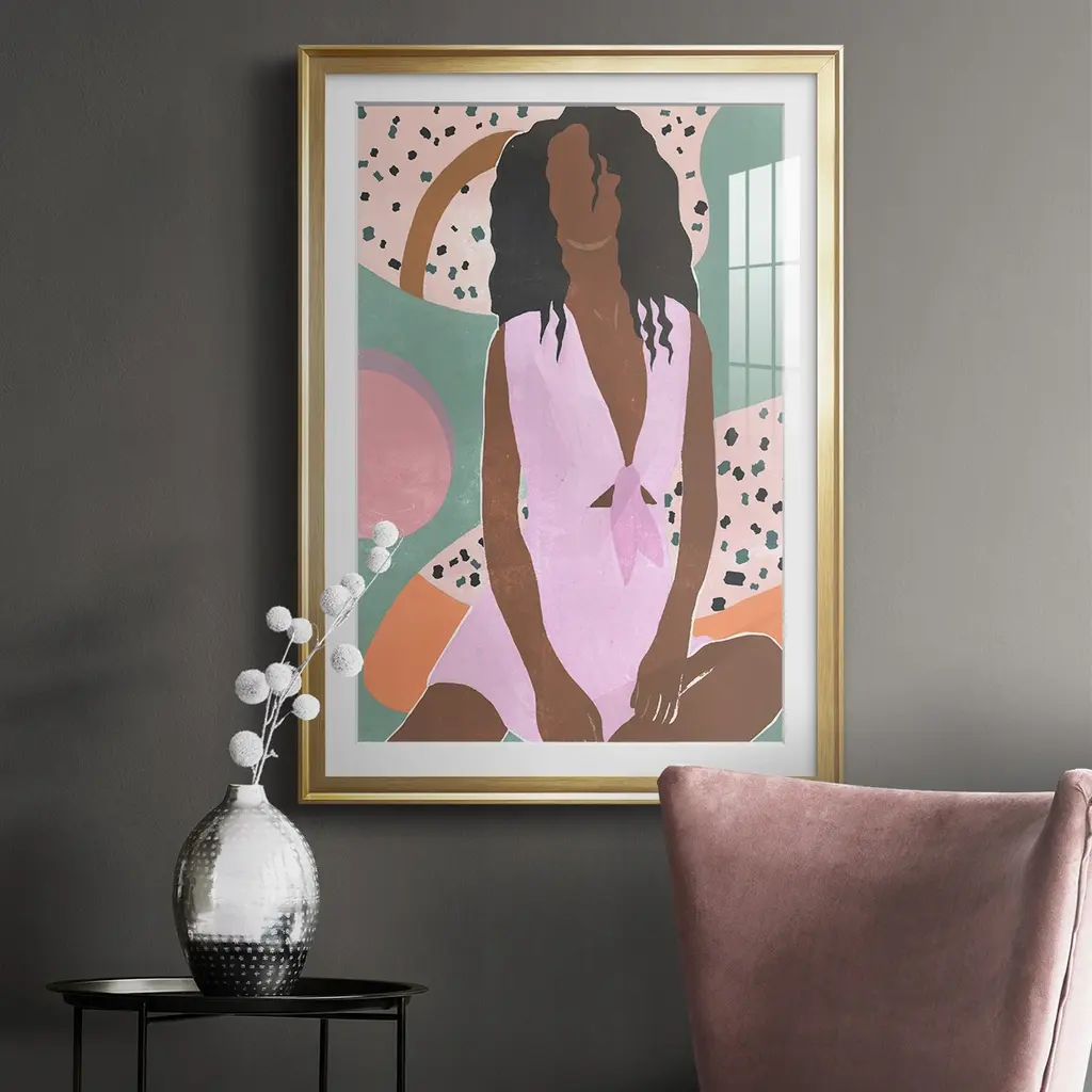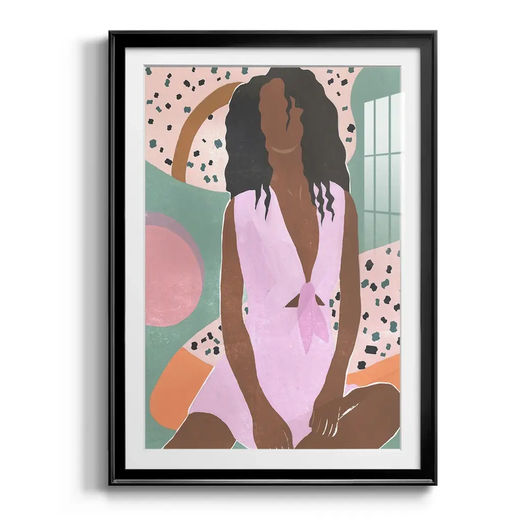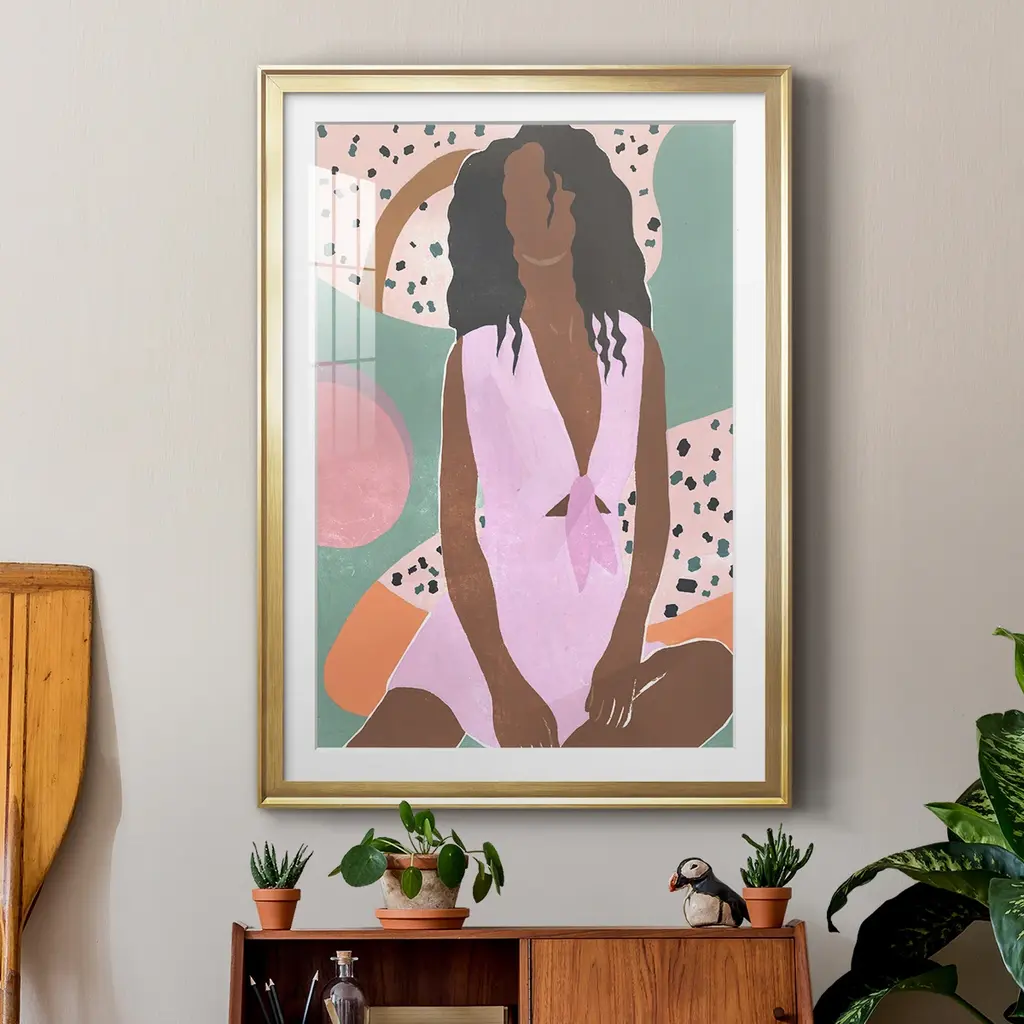 Curly Lady III Premium Framed Print - Ready to Hang A Premium Framed Print created to last. Framed in distressed wood and available in an array of sizes and colors Featuring a beveled a solid wood stretcher bar, each piece comes ready to hand 4 SIZES AVAILABLE 30.5''X42.5'' - Overall Size 26.5'X36.5'' - Overall Size 22.5''x30.5'' - Overall Size 18.5''x24.5'' - Overall Size Each piece is made to order. Each piece comes with hanging hardware. Made in the USA Ready to Hang Giclee Paper Print Acrylic Glass Beveled Matt Board