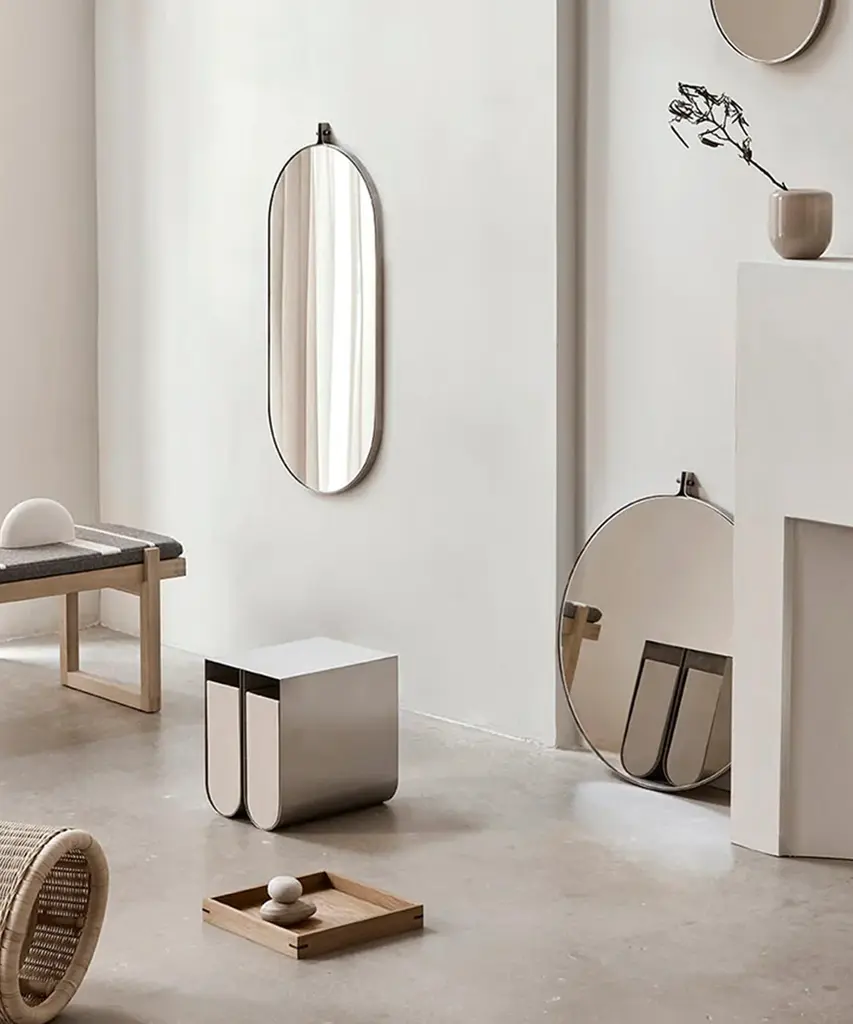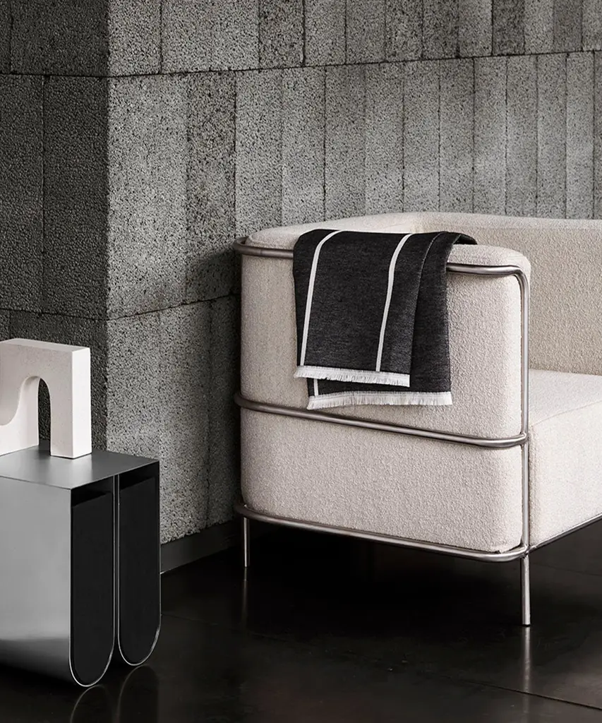 The Curved Boxes bring forth new storage possibilities for the Curved Bench and Curved side table. The Curved boxes can be inserted in the curves of the bench or side table adding an elegant storage solution to the furniture. The Curved boxes can also be transformed into an independent storage solution by clipping the two boxes together with the Curved Box Clips. The boxes are covered with a natural textile that reminds of architects’ sketchbooks. Size small fits into the Curved Side Table, Size Medium fits into the Curved Bench. Designed by Kristina Dam Studio in Copenhagen, Denmark.