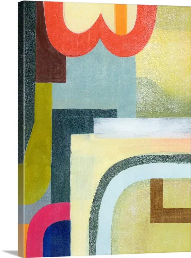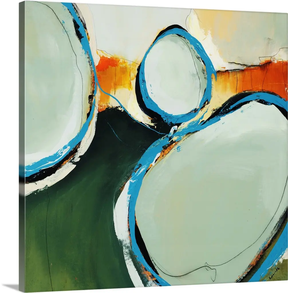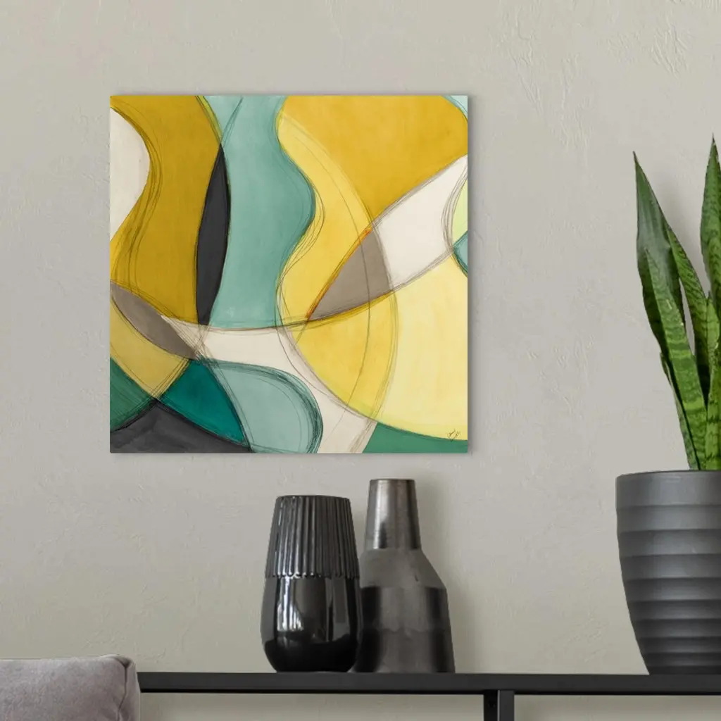 Abstract contemporary artwork in of swirling intersected shapes in blue and yellow.