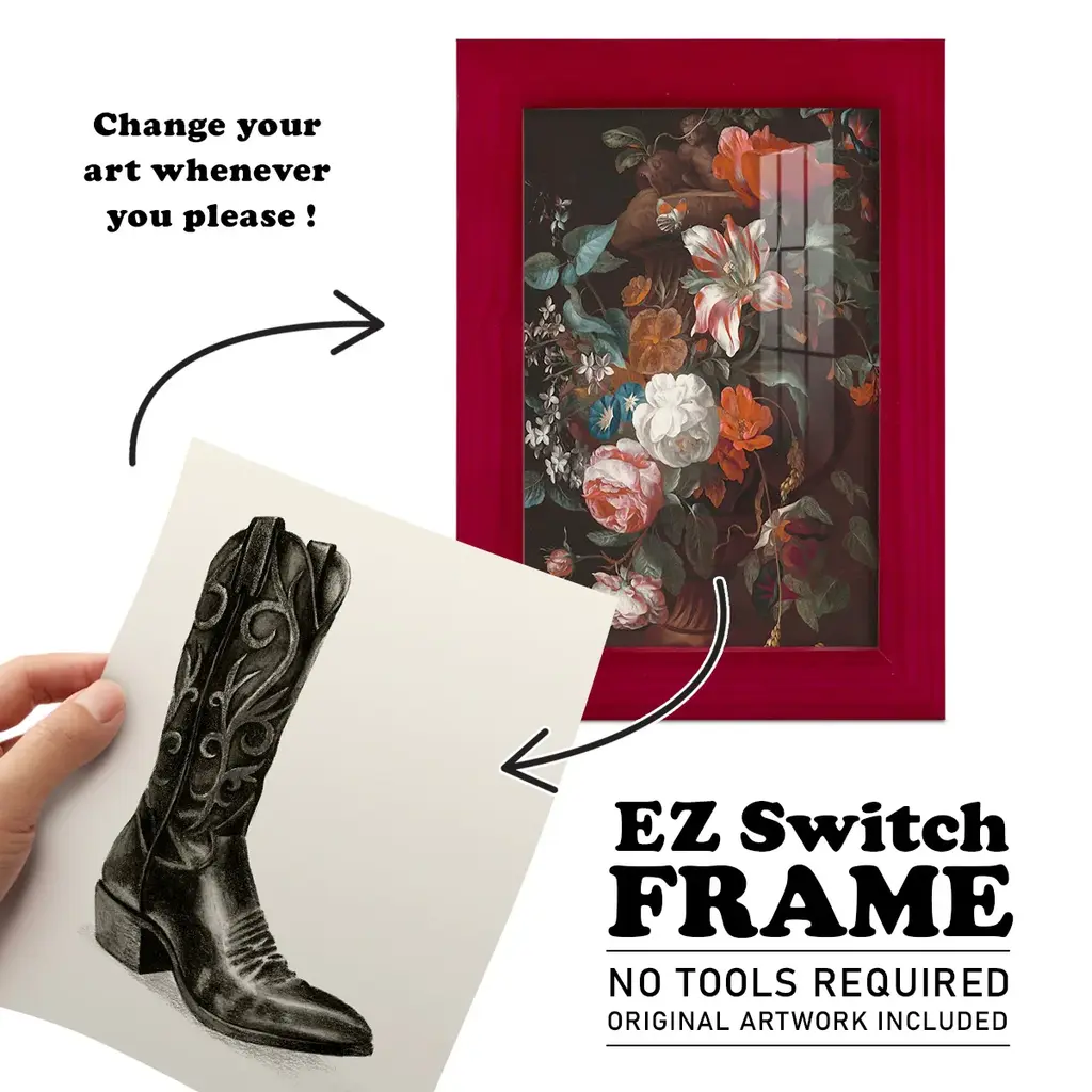 Custom Adagio VII -EZ SWITCH Framed Print w/glass-Cherry Red A delightful, framed print. Featuring a solid wood frame with real wood glass. This premium print is giclee quality. In addition, every frame features a removable back and table top stand. This allows you to change your art in the future or to just stand the art on a table for a new look. We are sure you'll enjoy our new series of EZ SWITCH Framed Art. Solid Wood Frame Real Glass Removable / Replaceable Art Built in Tabletop Stand Sizes range from 4x6 up to 12x15 - buy just one or pair them up as sets as you see fit.