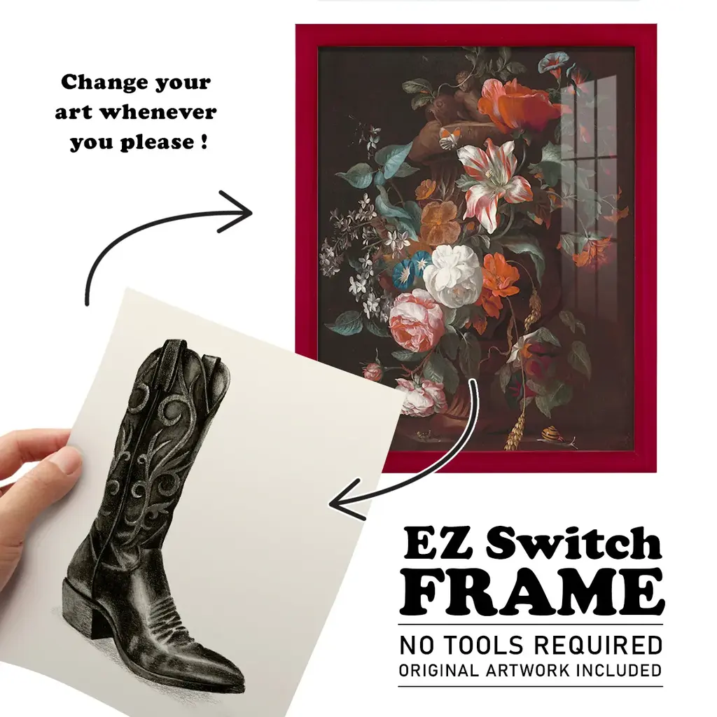 Custom Adagio VII -EZ SWITCH Framed Print w/glass-Cherry Red A delightful, framed print. Featuring a solid wood frame with real wood glass. This premium print is giclee quality. In addition, every frame features a removable back and table top stand. This allows you to change your art in the future or to just stand the art on a table for a new look. We are sure you'll enjoy our new series of EZ SWITCH Framed Art. Solid Wood Frame Real Glass Removable / Replaceable Art Built in Tabletop Stand Sizes range from 4x6 up to 12x15 - buy just one or pair them up as sets as you see fit.