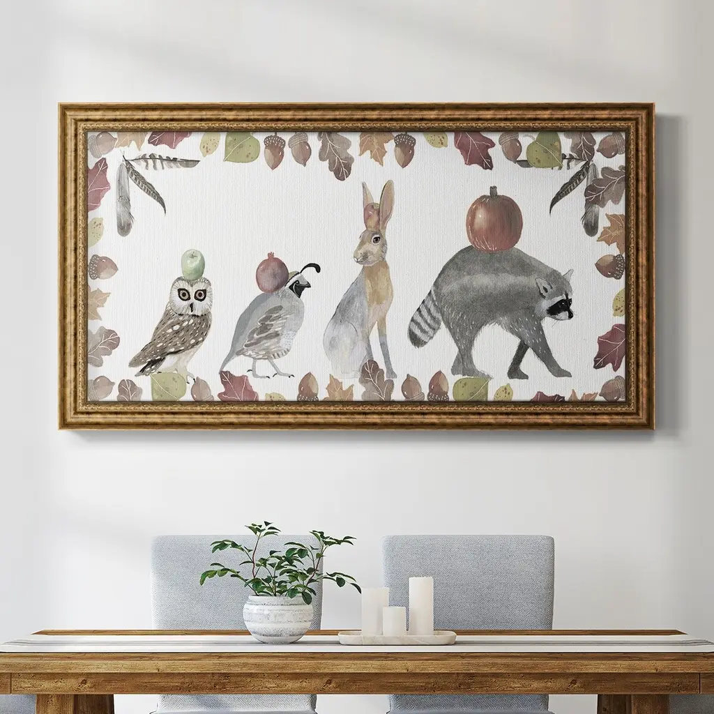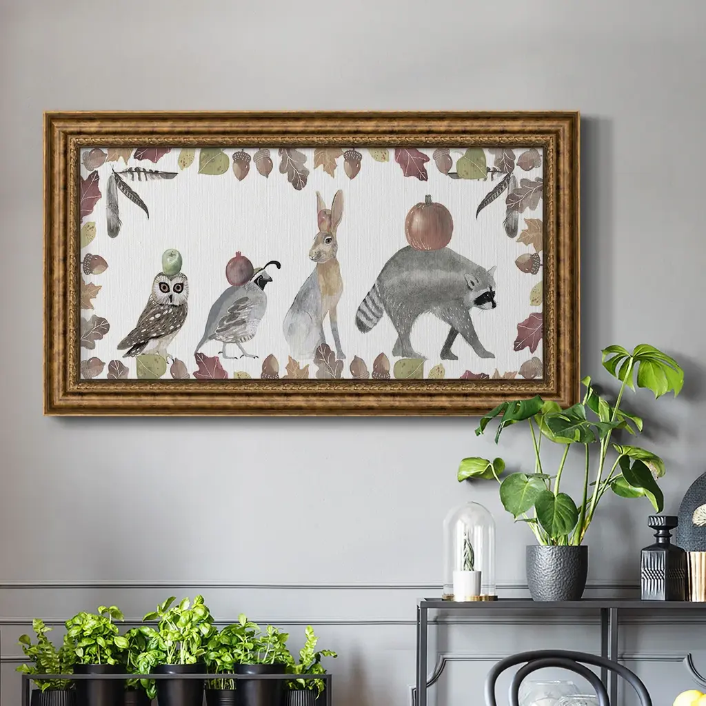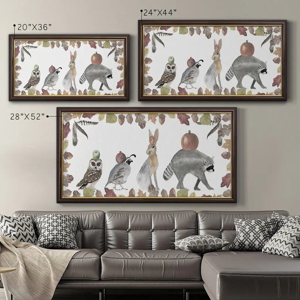 Cute Autumn Forest Collection D Premium Framed Canvas- Ready to Hang A Premium Framed Canvas created to last. Framed in distressed wood and available in an array of sizes and colors Featuring a beveled a solid wood stretcher bar, each piece comes ready to hand 3 SIZES AVAILABLE 21''X37'' - Overall Size 25''X45'' - Overall Size 29''x53'' - Overall Size Each piece is made to order. Each piece comes with hanging hardware. Made in the USA Ready to Hang Giclee Paper Print Acrylic Glass Beveled Matt Board