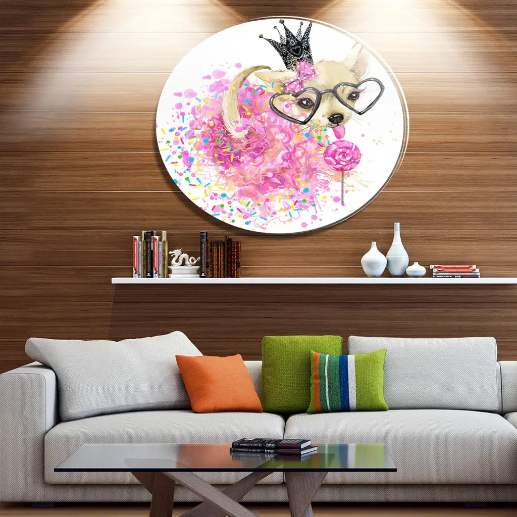 Bring Contemporary Abstraction to your home with this large Circle Metal wall art. This Cute Dog with Crown and Glasses Metal Artwork makes it the focal point of any room or office. - White Gloss Coating ensures colors are extra vibrant with light reflection.- Aluminum grade Sheet Metal with 1 inch mounting frame on the back giving the illusion that the artwork is floating on the wall..- Mounting Brackets are included along with instructions.- High Quality Digital images are created directly into a glossy aluminum panel producing a stunning and captivating print into the glossy finish of the metal.- Water, Fire and Scratch resistant HD Aluminum panels.- Looks better than any photo paper and guaranteed to last at least 20 years- Easy to clean with a microfiber cloth. Colors are far superior to regular Canvas Art. - Easy to Hang