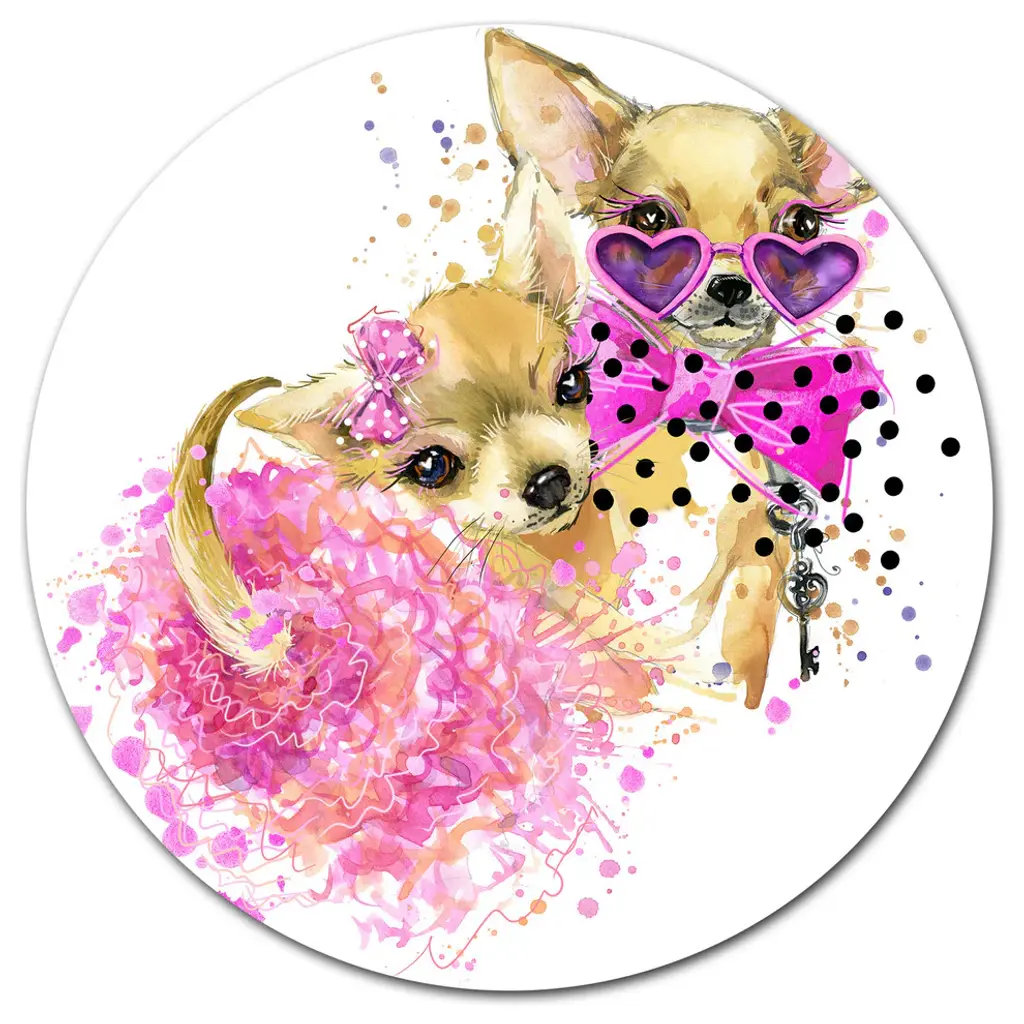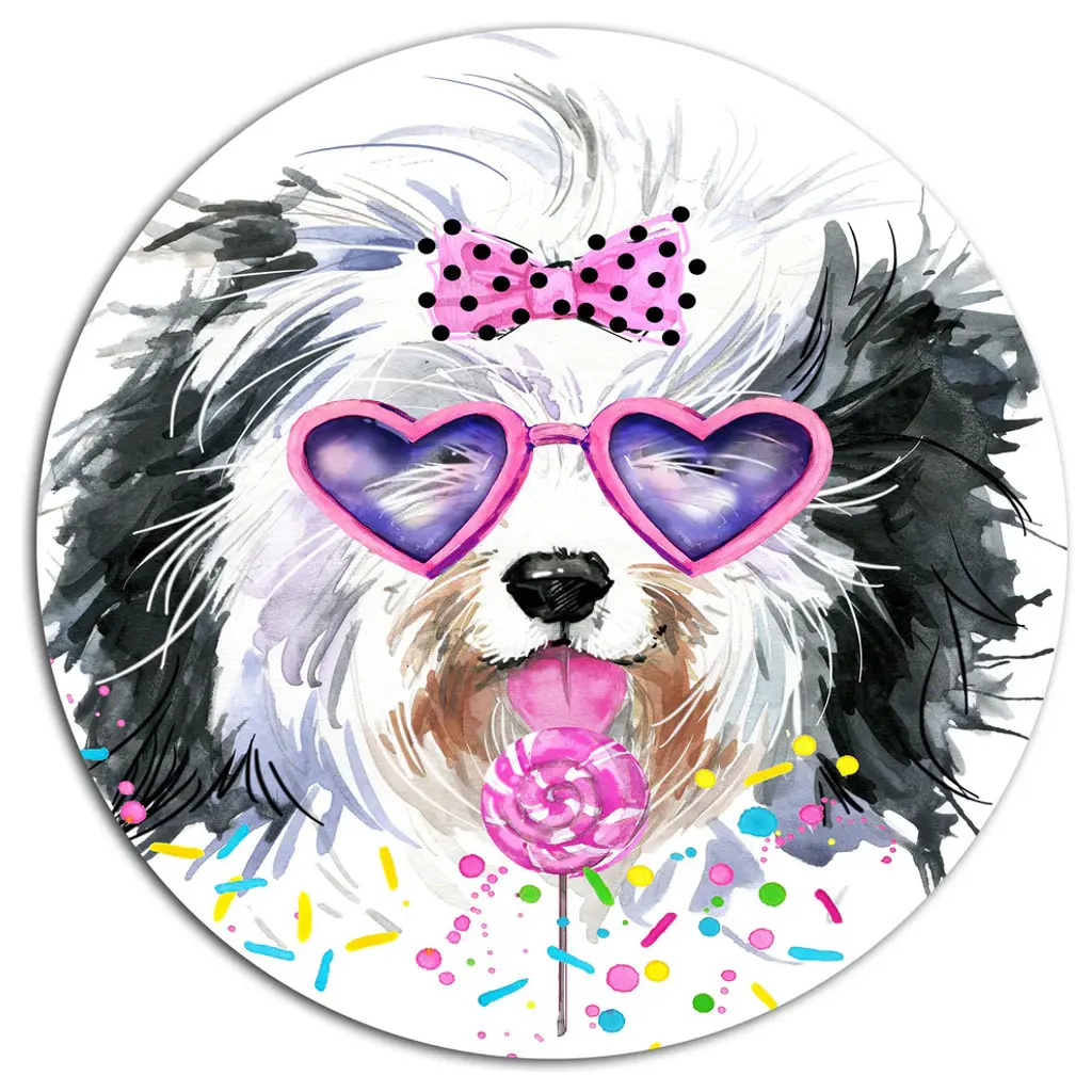 Bring Contemporary Abstraction to your home with this large Circle Metal wall art. This Cute Dog with Crown and Glasses Metal Artwork makes it the focal point of any room or office. - White Gloss Coating ensures colors are extra vibrant with light reflection.- Aluminum grade Sheet Metal with 1 inch mounting frame on the back giving the illusion that the artwork is floating on the wall..- Mounting Brackets are included along with instructions.- High Quality Digital images are created directly into a glossy aluminum panel producing a stunning and captivating print into the glossy finish of the metal.- Water, Fire and Scratch resistant HD Aluminum panels.- Looks better than any photo paper and guaranteed to last at least 20 years- Easy to clean with a microfiber cloth. Colors are far superior to regular Canvas Art. - Easy to Hang