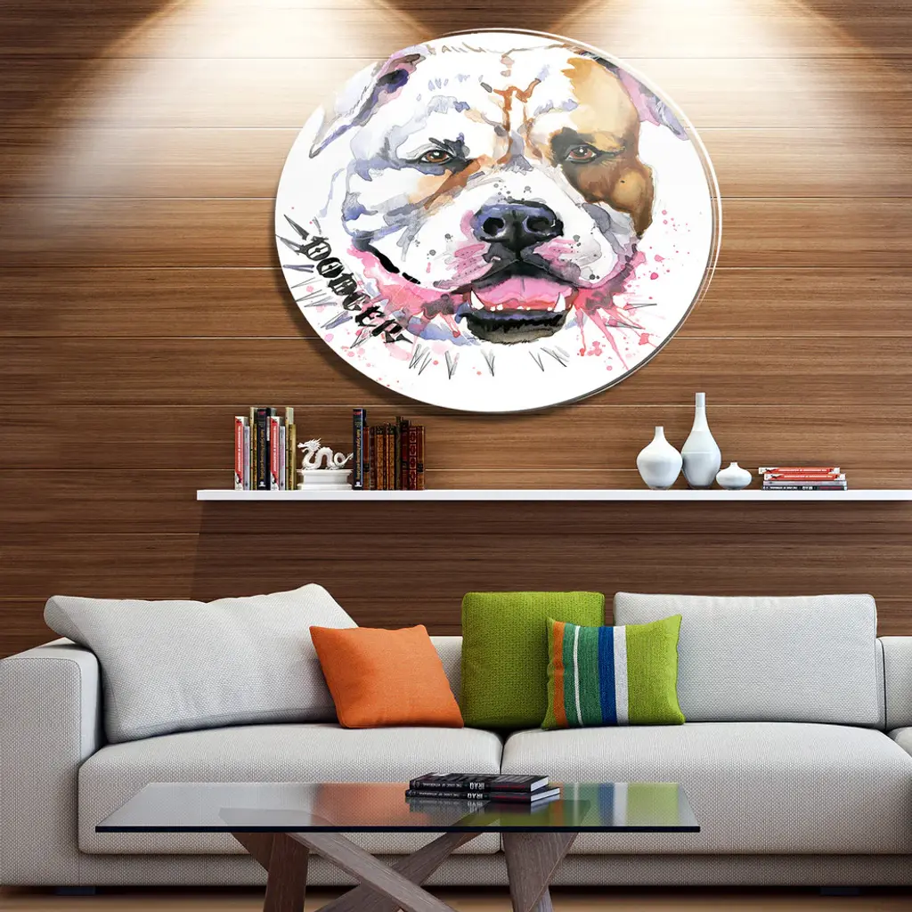 Bring Contemporary Abstraction to your home with this large Circle Metal wall art. This Cute Dog with Open Mouth Metal Artwork makes it the focal point of any room or office. - White Gloss Coating ensures colors are extra vibrant with light reflection.- Aluminum grade Sheet Metal with 1 inch mounting frame on the back giving the illusion that the artwork is floating on the wall..- Mounting Brackets are included along with instructions.- High Quality Digital images are created directly into a glossy aluminum panel producing a stunning and captivating print into the glossy finish of the metal.- Water, Fire and Scratch resistant HD Aluminum panels.- Looks better than any photo paper and guaranteed to last at least 20 years- Easy to clean with a microfiber cloth. Colors are far superior to regular Canvas Art. - Easy to Hang