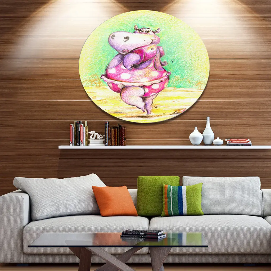Bring Contemporary Abstraction to your home with this large Circle Metal wall art. This Cute Hippo Goes Swimming Metal Artwork makes it the focal point of any room or office. - White Gloss Coating ensures colors are extra vibrant with light reflection.- Aluminum grade Sheet Metal with 1 inch mounting frame on the back giving the illusion that the artwork is floating on the wall..- Mounting Brackets are included along with instructions.- High Quality Digital images are created directly into a glossy aluminum panel producing a stunning and captivating print into the glossy finish of the metal.- Water, Fire and Scratch resistant HD Aluminum panels.- Looks better than any photo paper and guaranteed to last at least 20 years- Easy to clean with a microfiber cloth. Colors are far superior to regular Canvas Art. - Easy to Hang