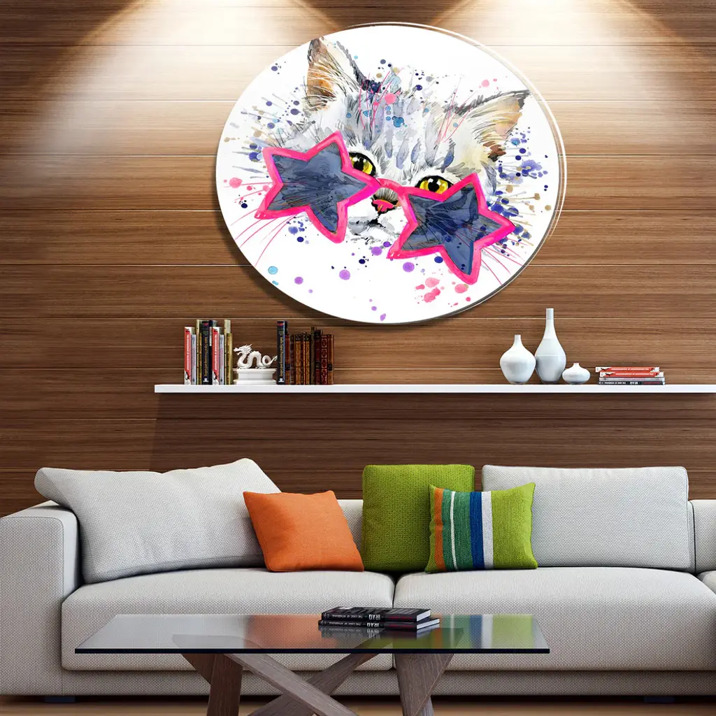 Bring Contemporary Abstraction to your home with this large Circle Metal wall art. This Cute Kitten with Blue Stars Metal Artwork makes it the focal point of any room or office. - White Gloss Coating ensures colors are extra vibrant with light reflection.- Aluminum grade Sheet Metal with 1 inch mounting frame on the back giving the illusion that the artwork is floating on the wall..- Mounting Brackets are included along with instructions.- High Quality Digital images are created directly into a glossy aluminum panel producing a stunning and captivating print into the glossy finish of the metal.- Water, Fire and Scratch resistant HD Aluminum panels.- Looks better than any photo paper and guaranteed to last at least 20 years- Easy to clean with a microfiber cloth. Colors are far superior to regular Canvas Art. - Easy to Hang