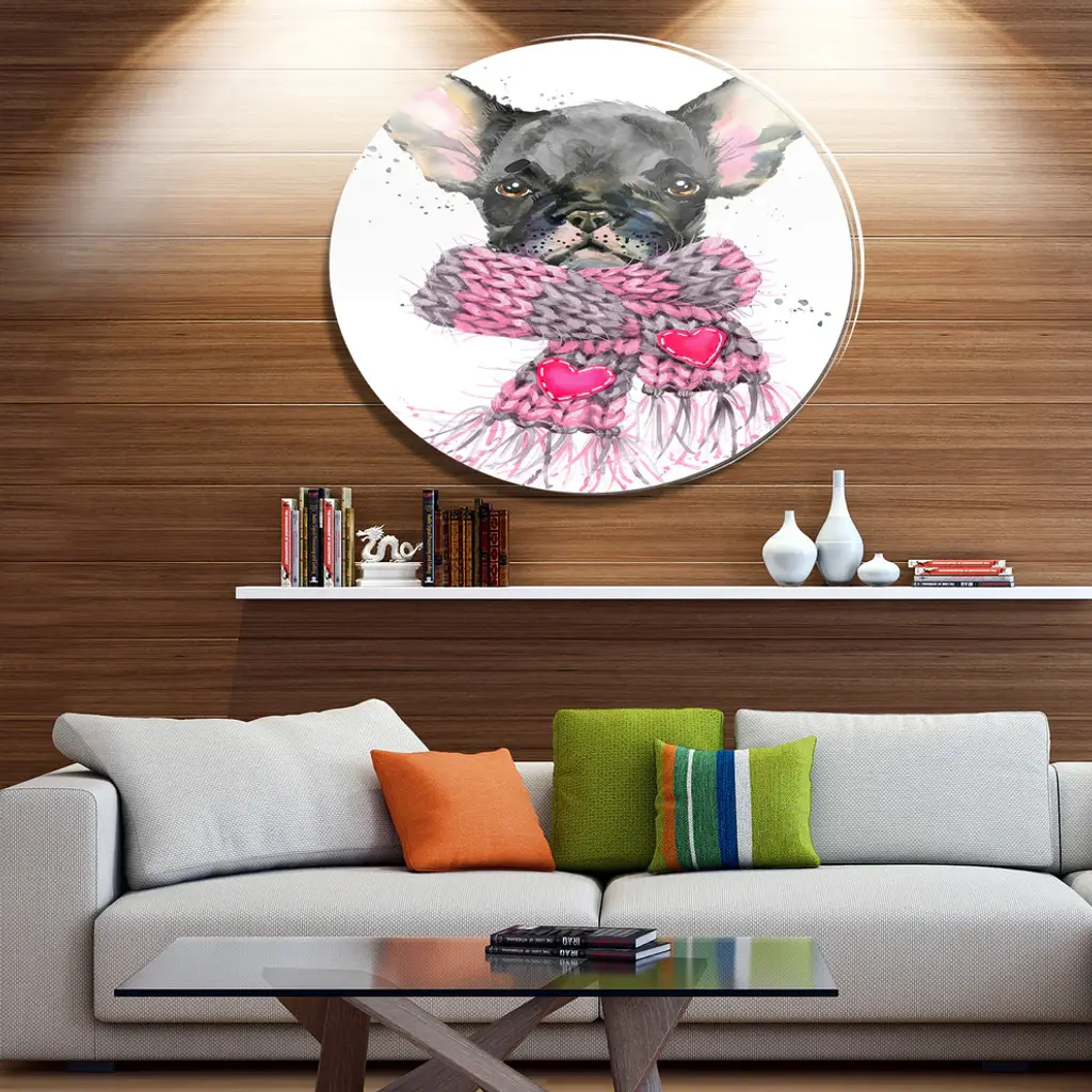 Bring Contemporary Abstraction to your home with this large Circle Metal wall art. This Cute Puppy Dog with Pink Shawl Metal Artwork makes it the focal point of any room or office. - White Gloss Coating ensures colors are extra vibrant with light reflection.- Aluminum grade Sheet Metal with 1 inch mounting frame on the back giving the illusion that the artwork is floating on the wall..- Mounting Brackets are included along with instructions.- High Quality Digital images are created directly into a glossy aluminum panel producing a stunning and captivating print into the glossy finish of the metal.- Water, Fire and Scratch resistant HD Aluminum panels.- Looks better than any photo paper and guaranteed to last at least 20 years- Easy to clean with a microfiber cloth. Colors are far superior to regular Canvas Art. - Easy to Hang