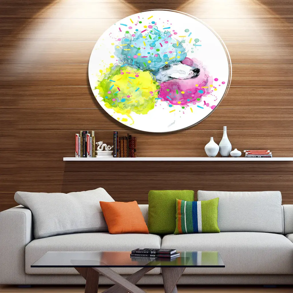 Bring Contemporary Abstraction to your home with this large Circle Metal wall art. This Cute White Dog with Color Spheres Metal Artwork makes it the focal point of any room or office. - White Gloss Coating ensures colors are extra vibrant with light reflection.- Aluminum grade Sheet Metal with 1 inch mounting frame on the back giving the illusion that the artwork is floating on the wall..- Mounting Brackets are included along with instructions.- High Quality Digital images are created directly into a glossy aluminum panel producing a stunning and captivating print into the glossy finish of the metal.- Water, Fire and Scratch resistant HD Aluminum panels.- Looks better than any photo paper and guaranteed to last at least 20 years- Easy to clean with a microfiber cloth. Colors are far superior to regular Canvas Art. - Easy to Hang