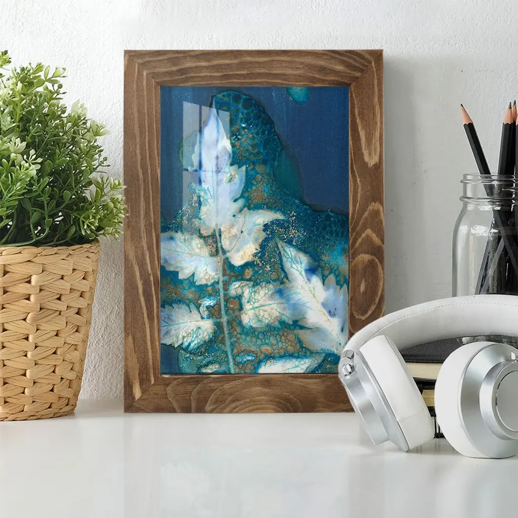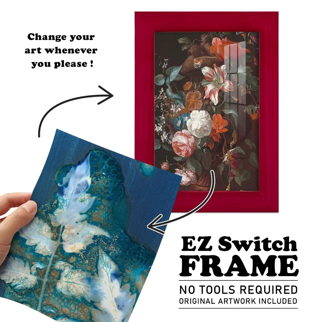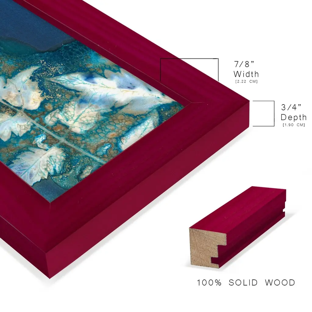 Cyanotype Leaves II -EZ SWITCH Framed Print w/glass-Cherry Red A delightful, framed print. Featuring a solid wood frame with real wood glass. This premium print is giclee quality. In addition, every frame features a removable back and table top stand. This allows you to change your art in the future or to just stand the art on a table for a new look. We are sure you'll enjoy our new series of EZ SWITCH Framed Art. Solid Wood Frame Real Glass Removable / Replaceable Art Built in Tabletop Stand Sizes range from 4x6 up to 12x15 - buy just one or pair them up as sets as you see fit.