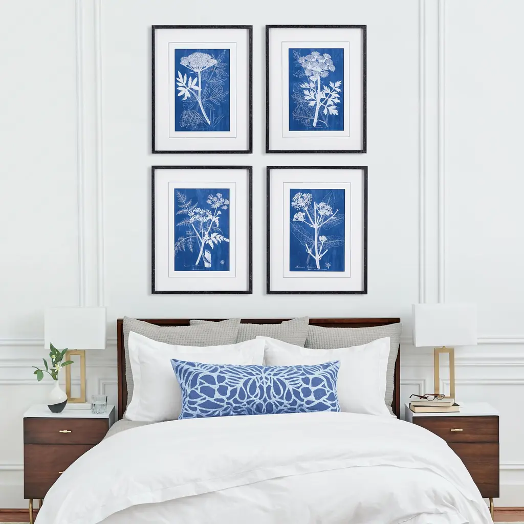 In a play on positive and negative space, these cyan prints highlight the beauty of the magnificent queen Anne's lace. The deep, rich blue tone continues to be a popular accent color for home office, study or foyer.