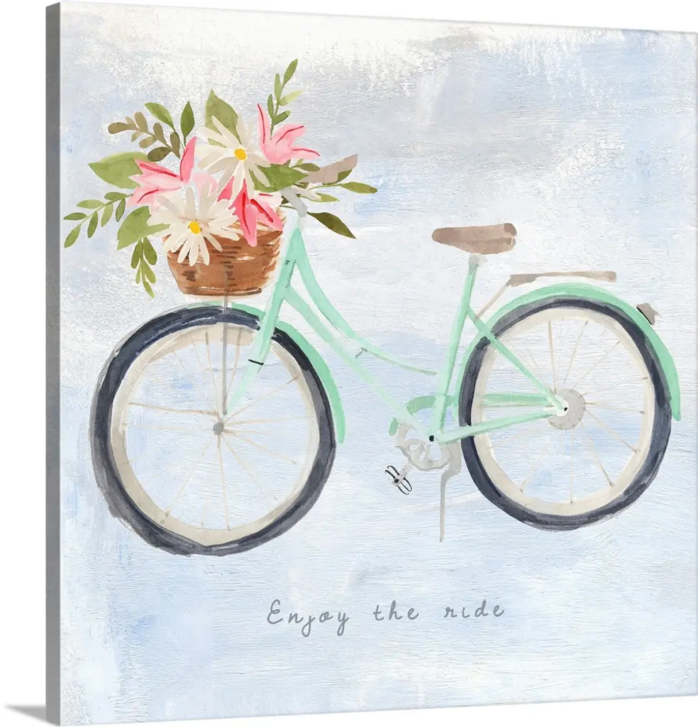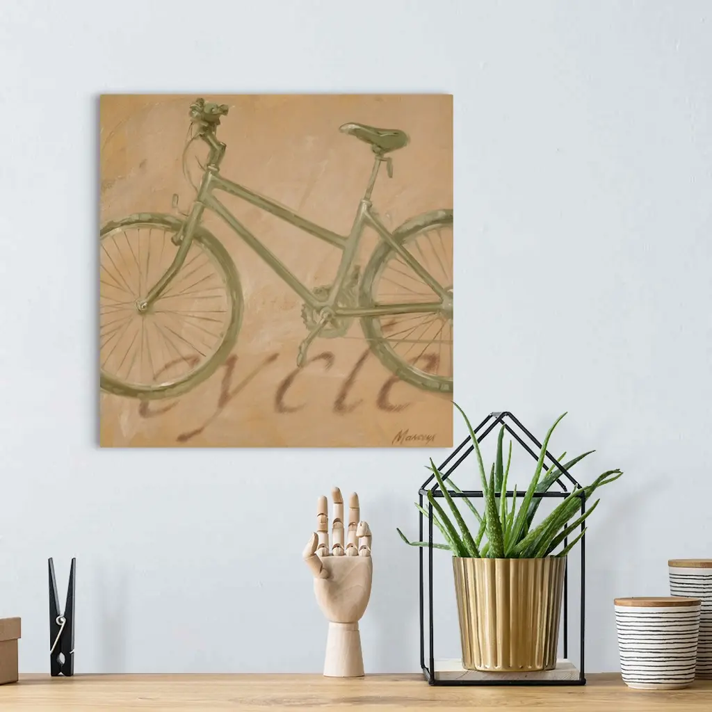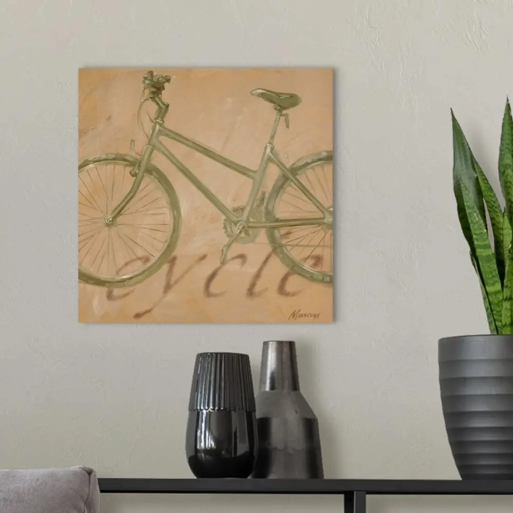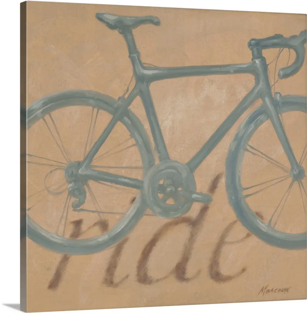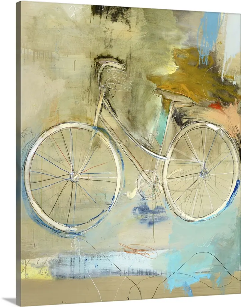 A square painting with a limited color palette of a bicycle, the wheels have been cropped out; faded text at the bottom says ocycleo.