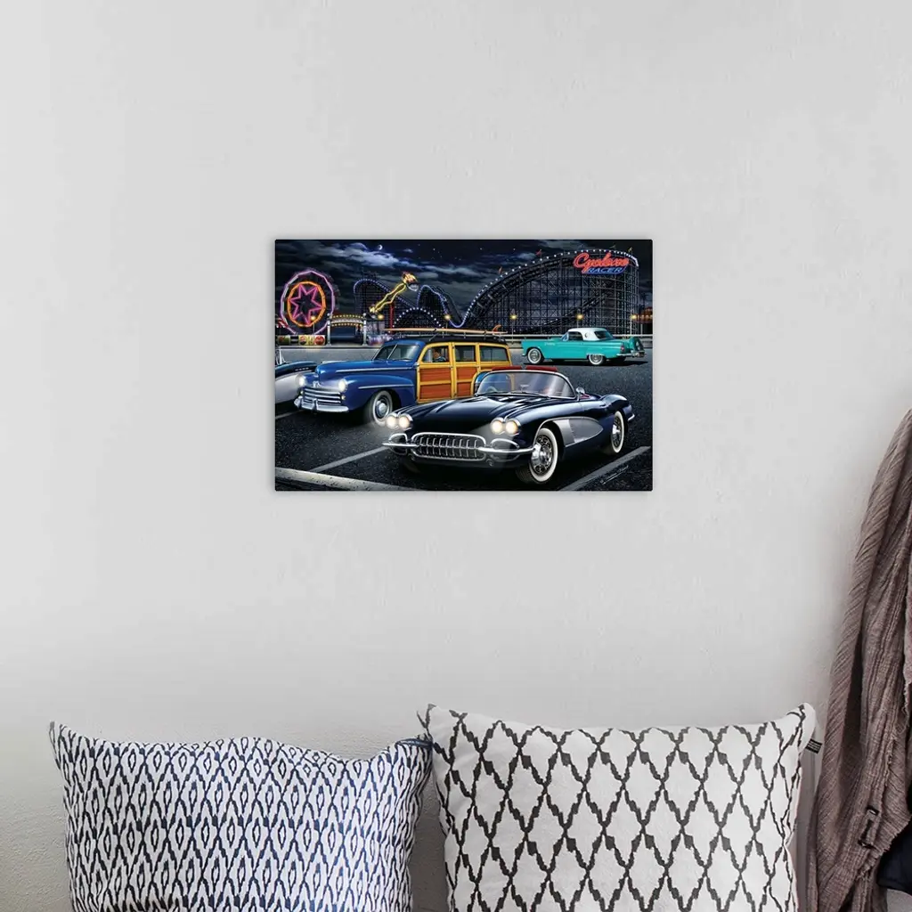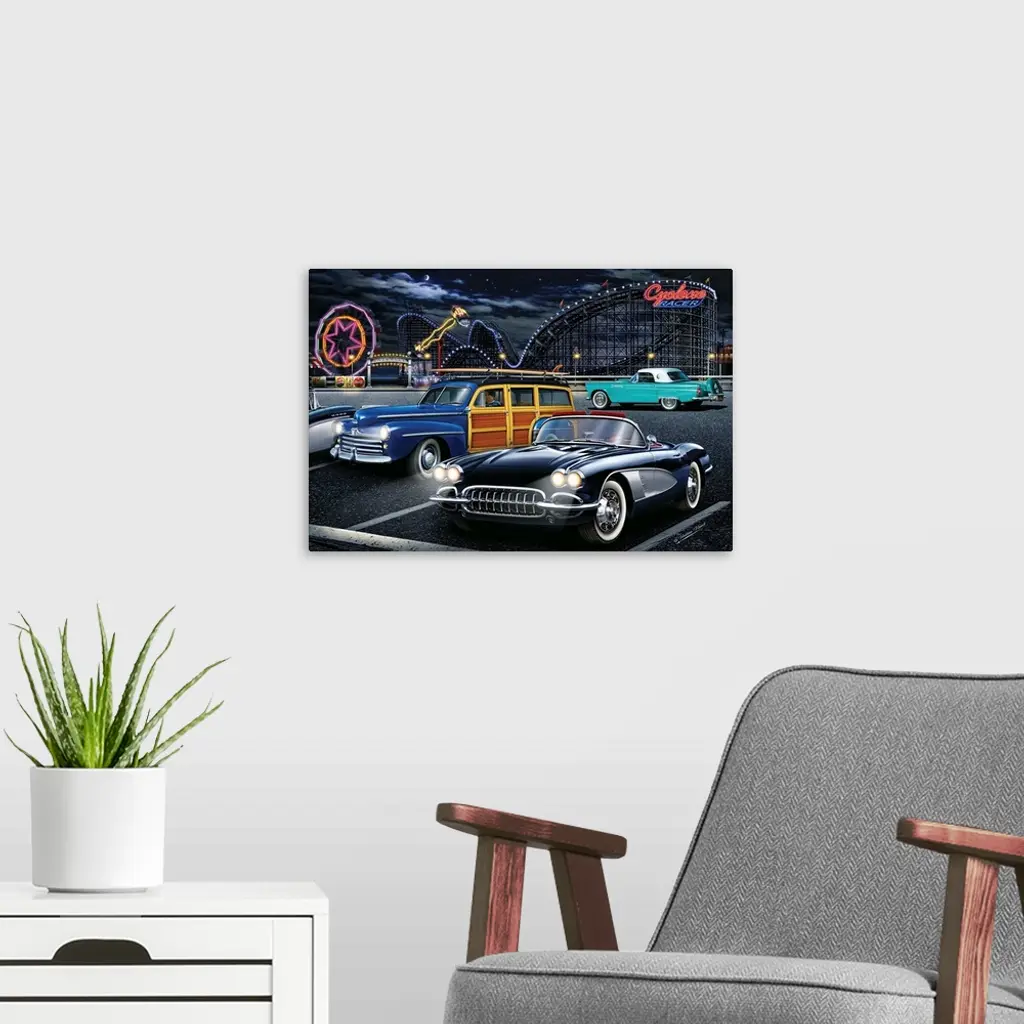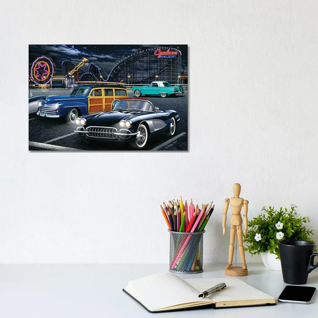 Digital art painting of the Cyclone Racer roller coaster in Long Beach, California with classic cars by Helen Flint.