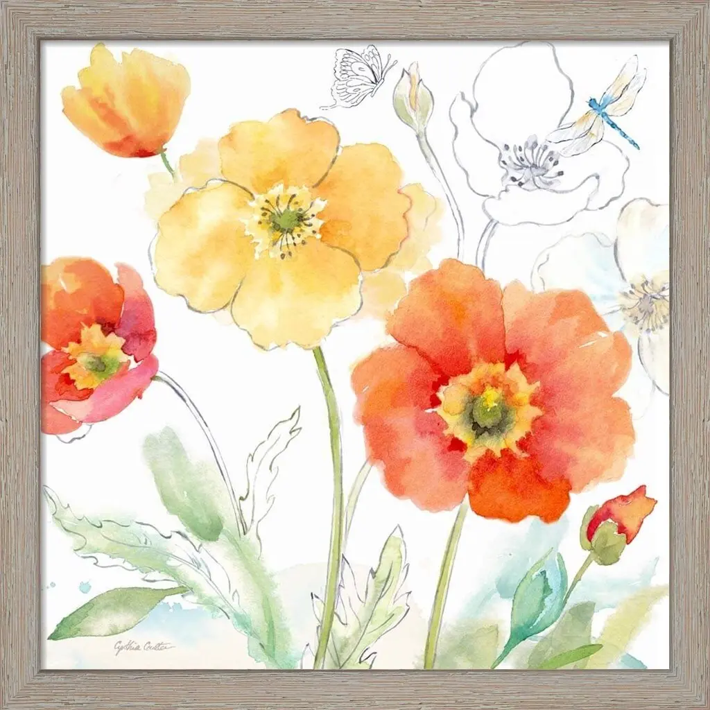 Happy Poppies IV by Cynthia Coulter is a high quality piece of framed artwork. The finished size of this piece is 13" X 13". It has a Distressed Aged White Wash frame and is finished with high quality glass. 100% Satisfaction Guaranteed.