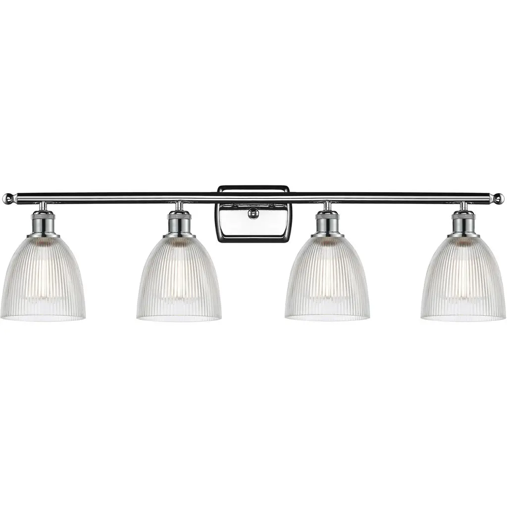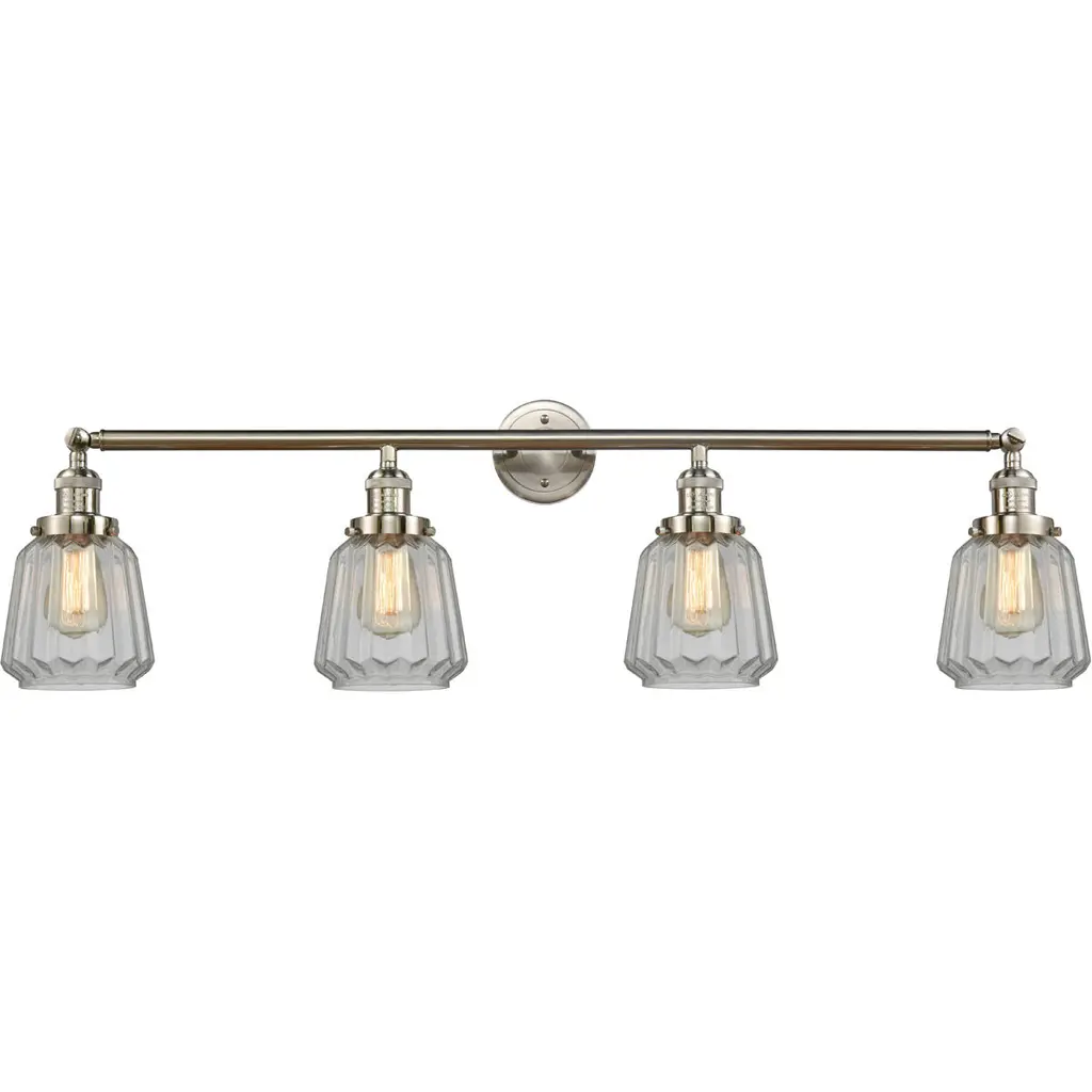 Strong details and with an elegant twist. The Cypress Grove 4 light vanity light pairs industrial form with intricate fluted glass to create something unforgettable. This indoor damp-rated fixture makes a statement in transitional and modern bathrooms. Carry this industrial theme throughout your space by pairing this vanity light with other fixtures fro the Cypress Grove collection.