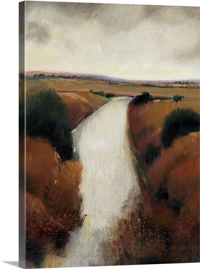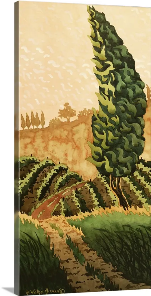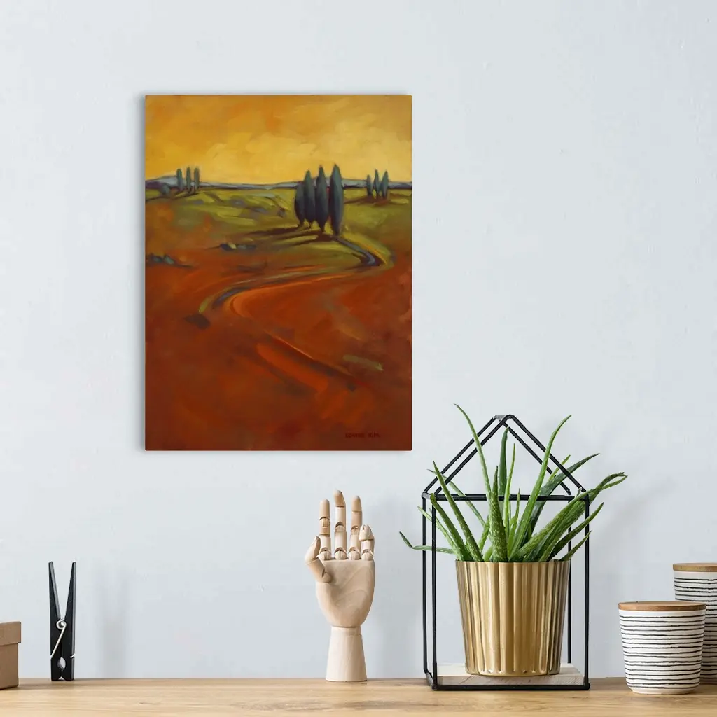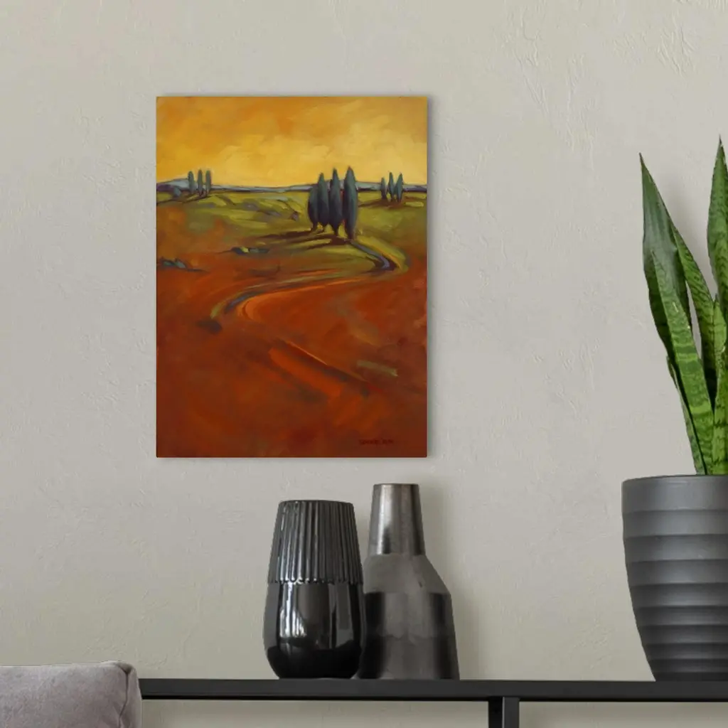 A contemporary painting of cypress trees on a hill in warm colors of orange and yellow.