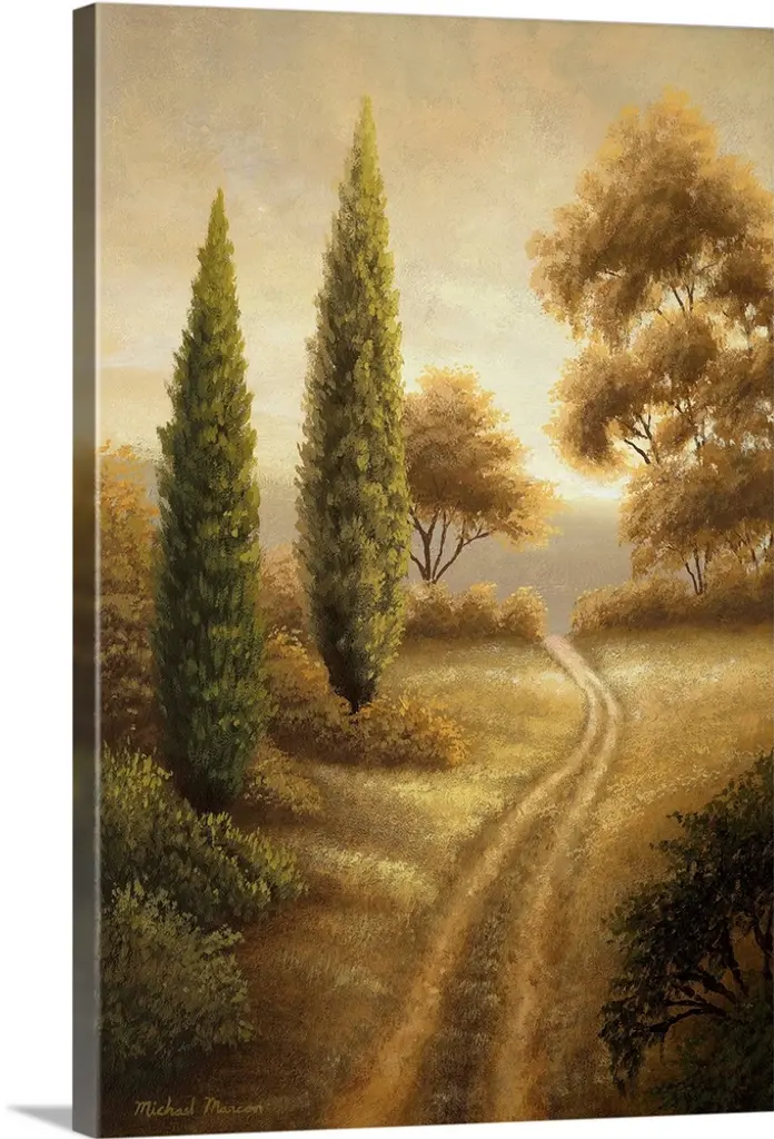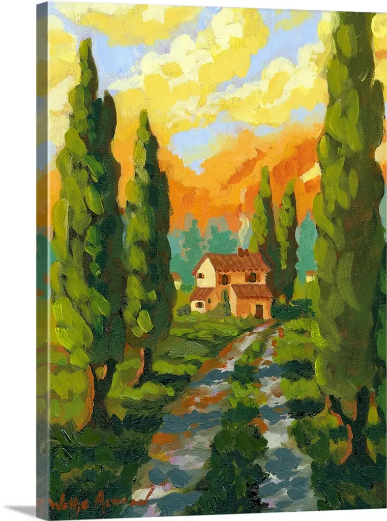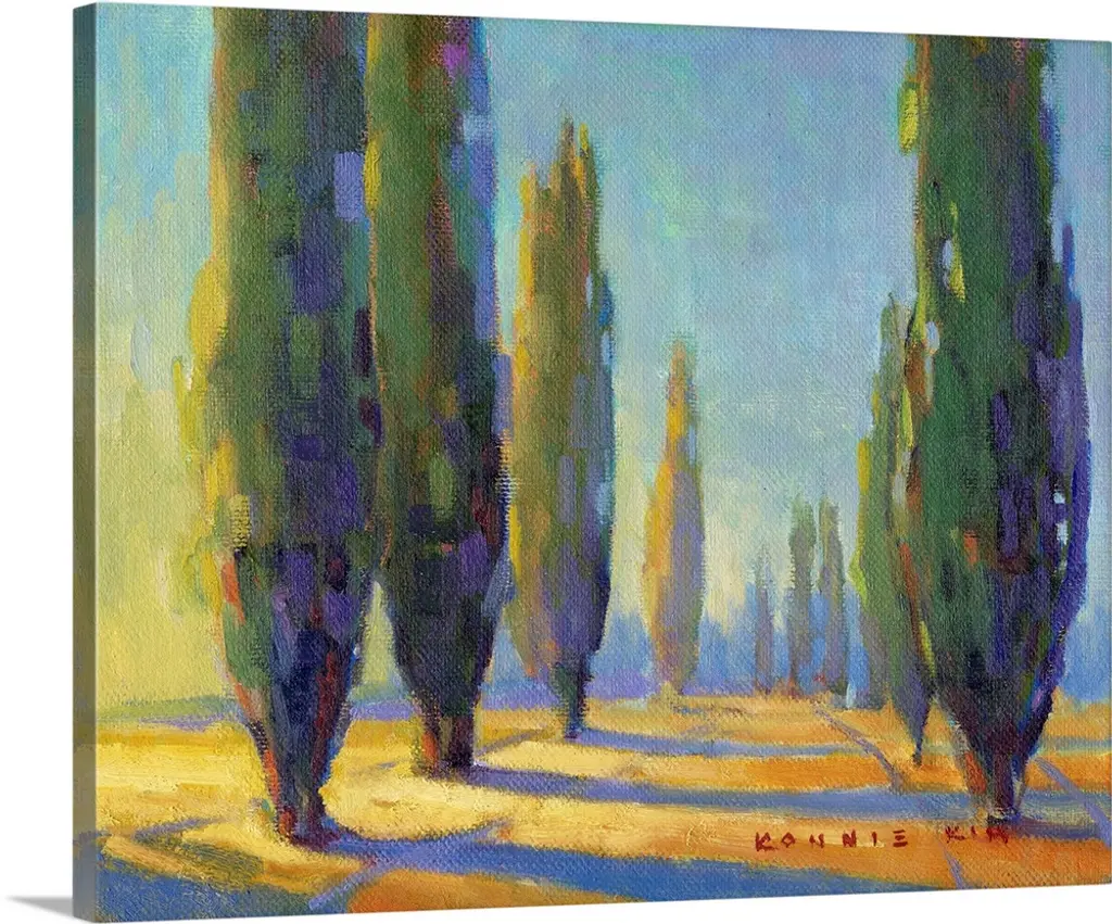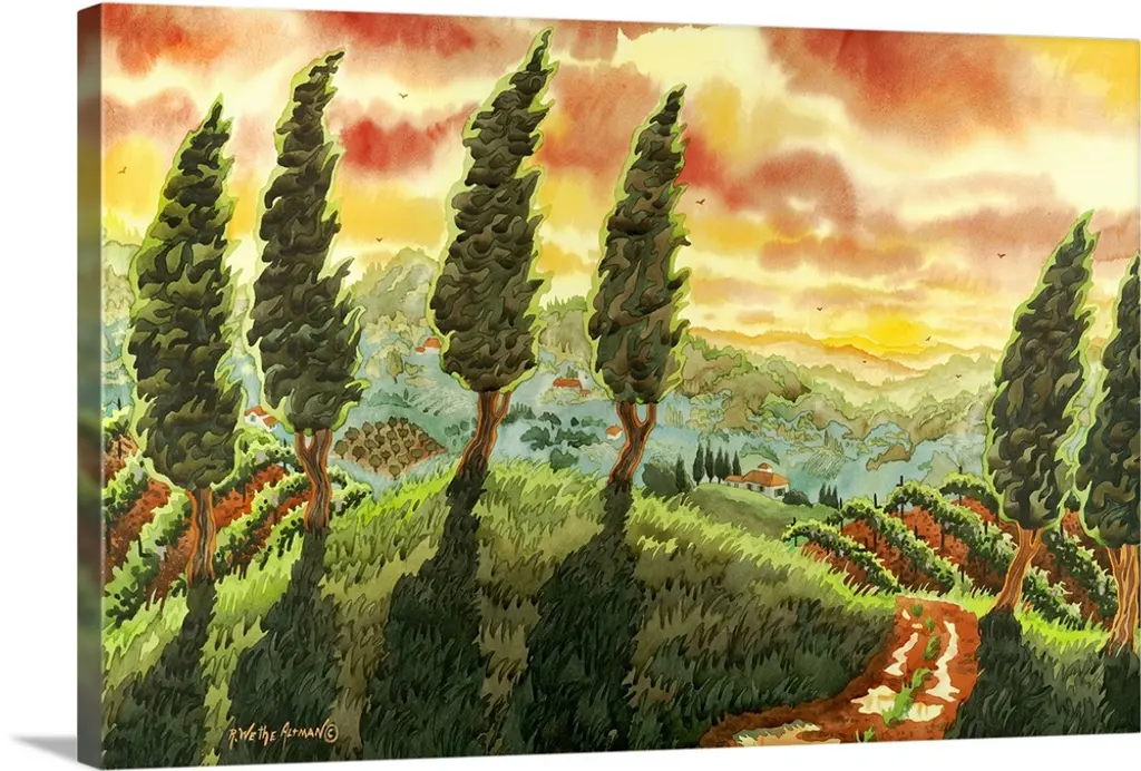 Painting of a row of cypress trees in the Italian countryside.