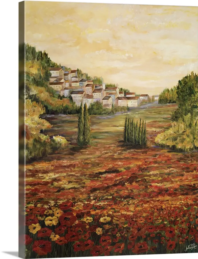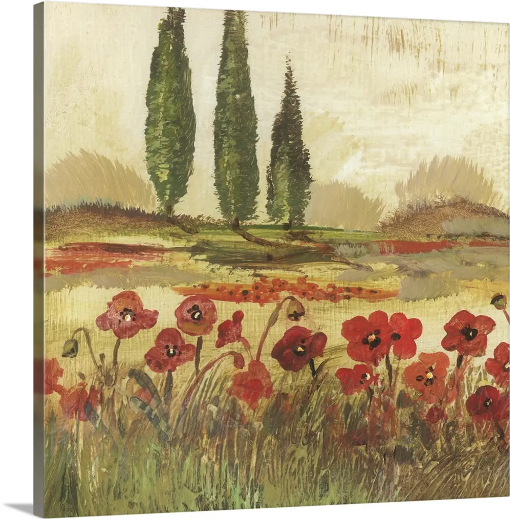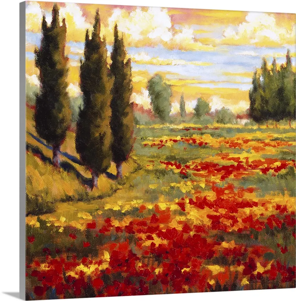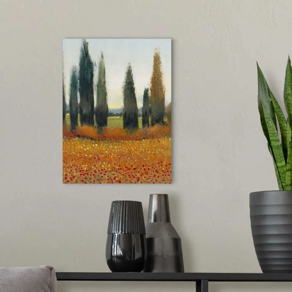 Painting of a row of cypress trees in the Italian countryside.