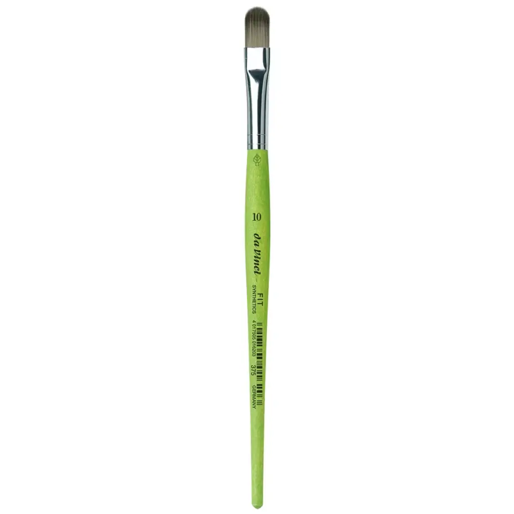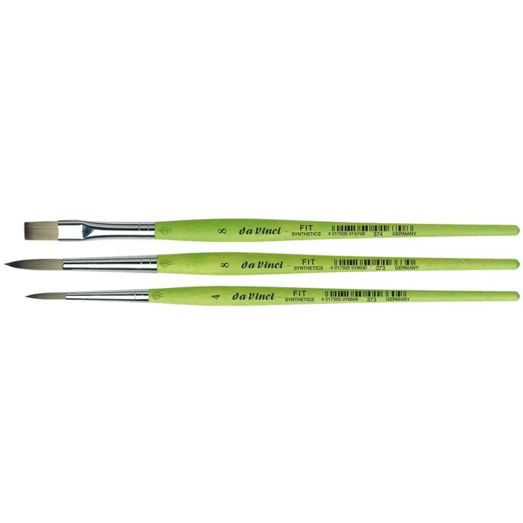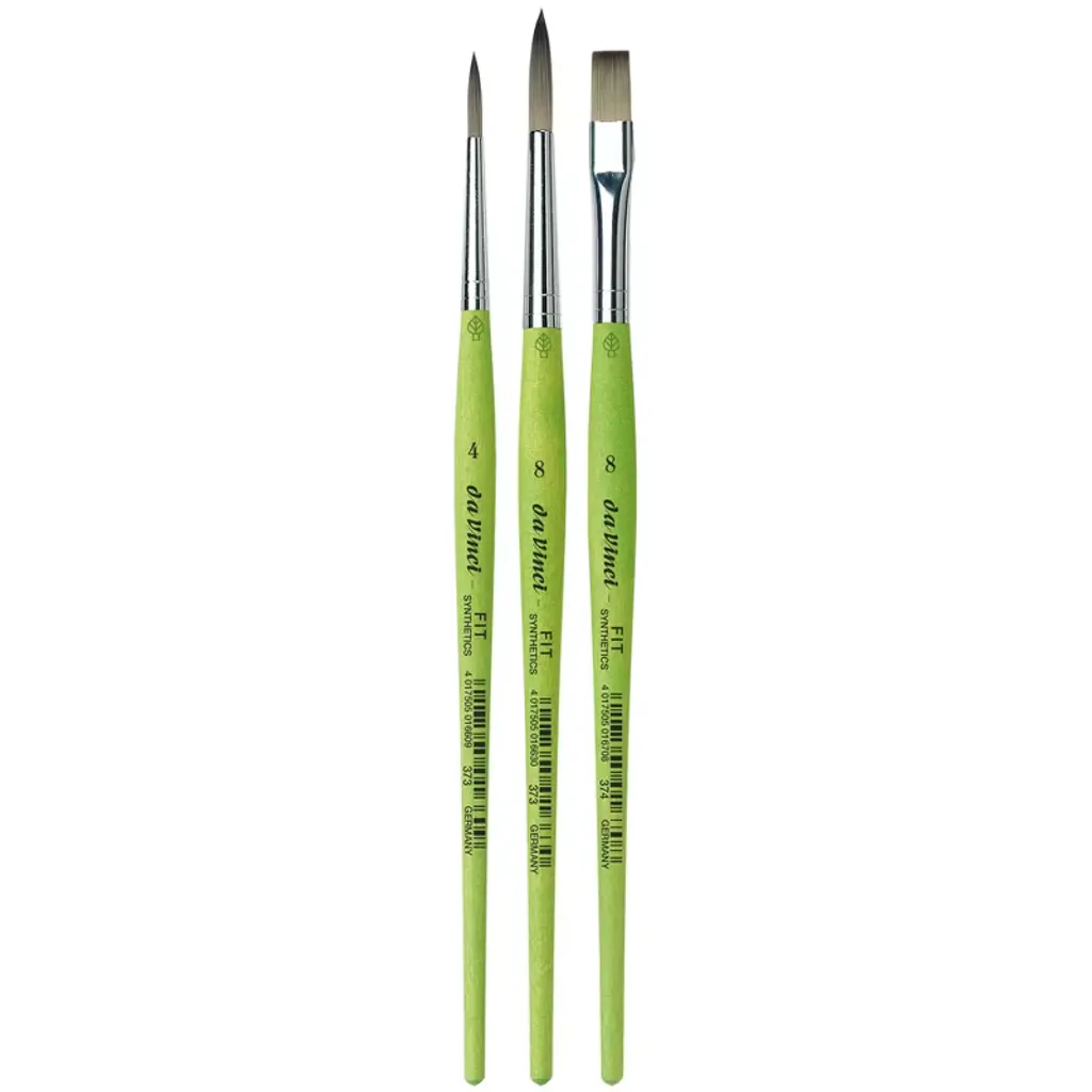 da Vinci FIT Synthetics Student & Hobby Brushes, Synthetic, Acrylic & Tempera, Assorted, 3 Brush Set | Thanks to a specifically developed, flexible, grey synthetic fiber we have created a hobby and school painting brush, which fascinates not only by its interesting look but also by its attractive price. This innovative product offers better performance than the traditional school brush with natural hair when it comes to stroke control and color absorbing capacity. The brush features a green, matte handle with seamless, rust-proof aluminum ferrules. Made in Germany. 100% Vegan. This set contains: Series 373 Size 4 and 8 as well as Series 374 Size 8.