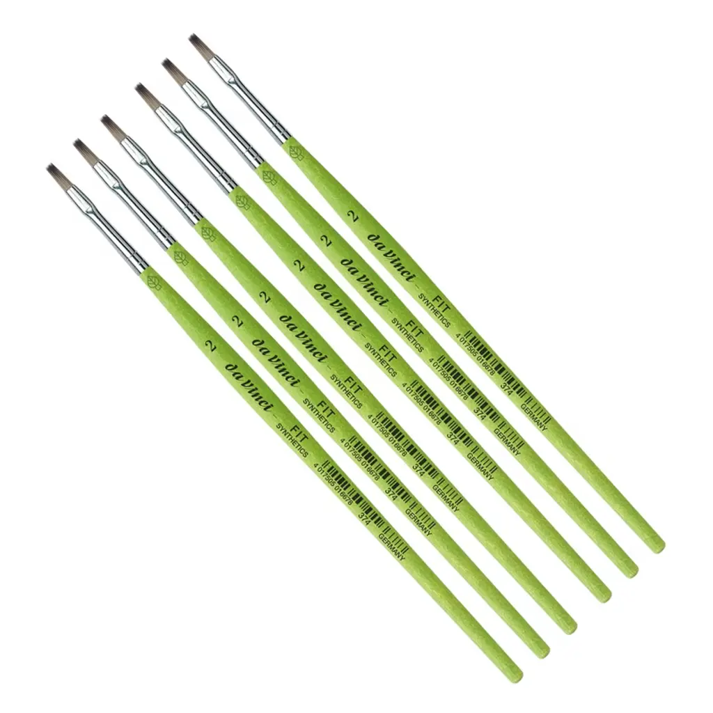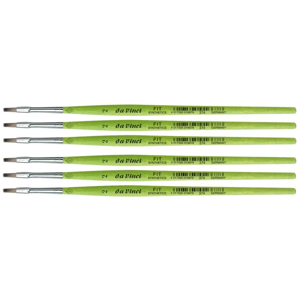 da Vinci FIT Synthetics Student Brush, Synthetic, Acrylic & Tempera, Flat, Series 374, Size 2, Pack of 6 | Thanks to a specifically developed, flexible, grey synthetic fiber we have created a hobby and school painting brush, which fascinates not only by its interesting look but also by its attractive price. This innovative product offers better performance than the traditional school brush with natural hair when it comes to stroke control and color absorbing capacity. The brush features a green, matte handle with seamless, rust-proof aluminum ferrules. Made in Germany. 100% Vegan. Sold as a pack of 6.